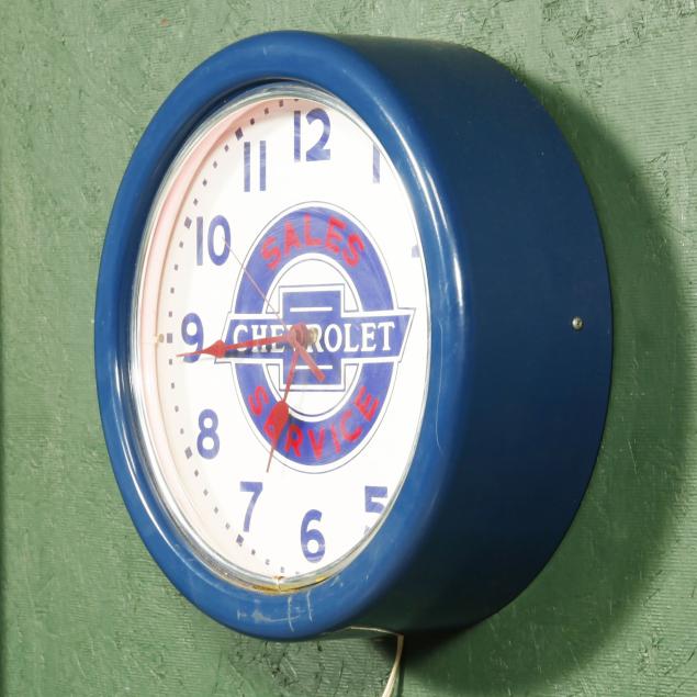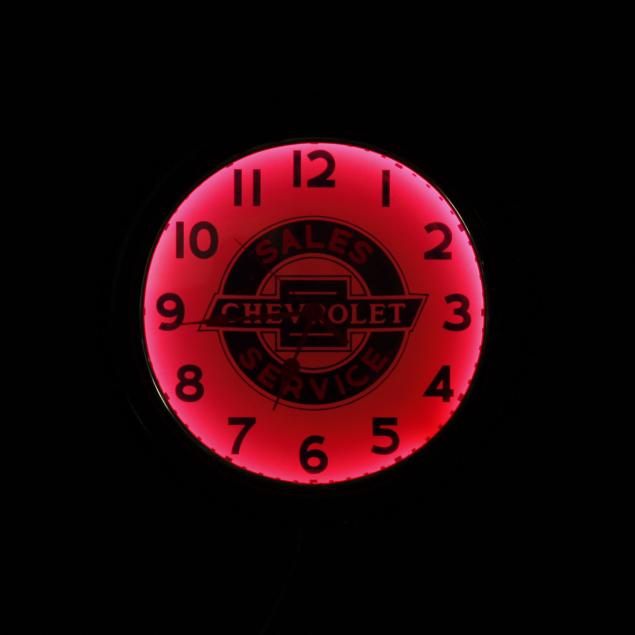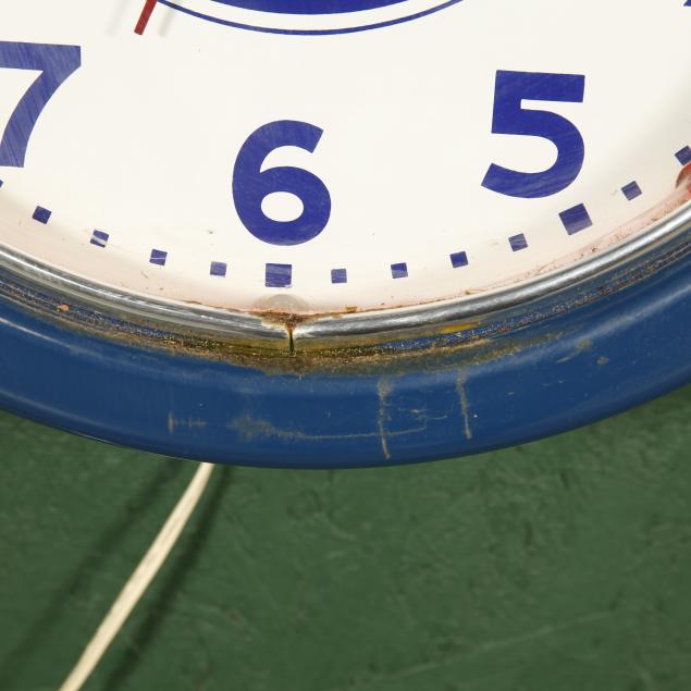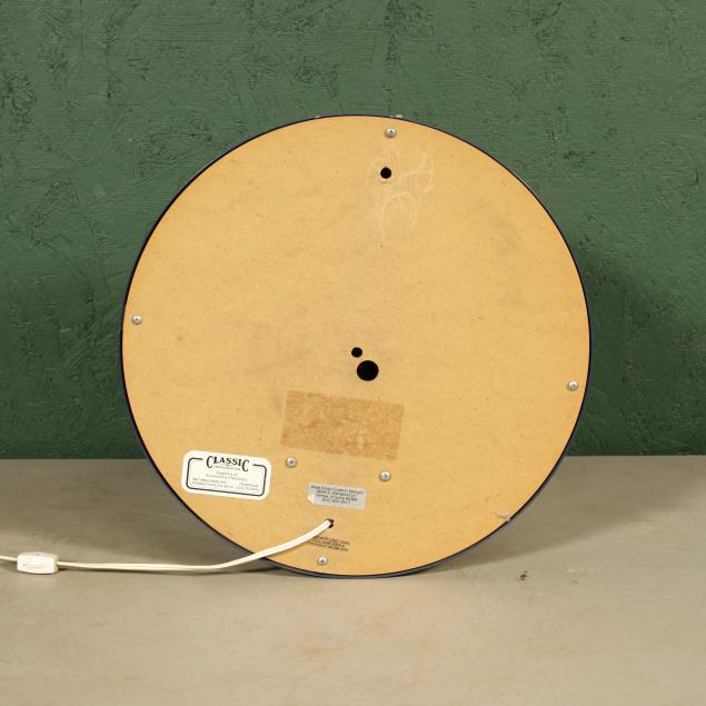 Manufactured by Classic Transportation. With a blue case, white face, blue numbers, and red neon.
