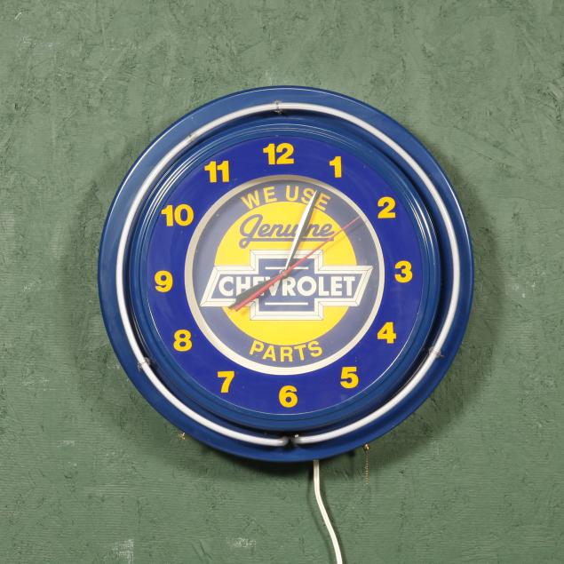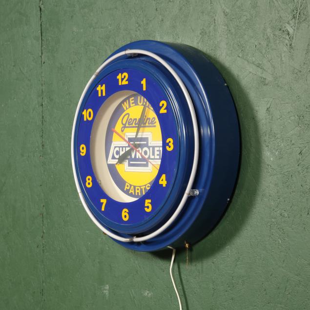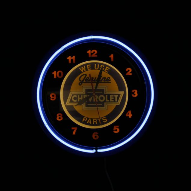 With a blue case, white face, yellow backlit numbers, and blue neon.