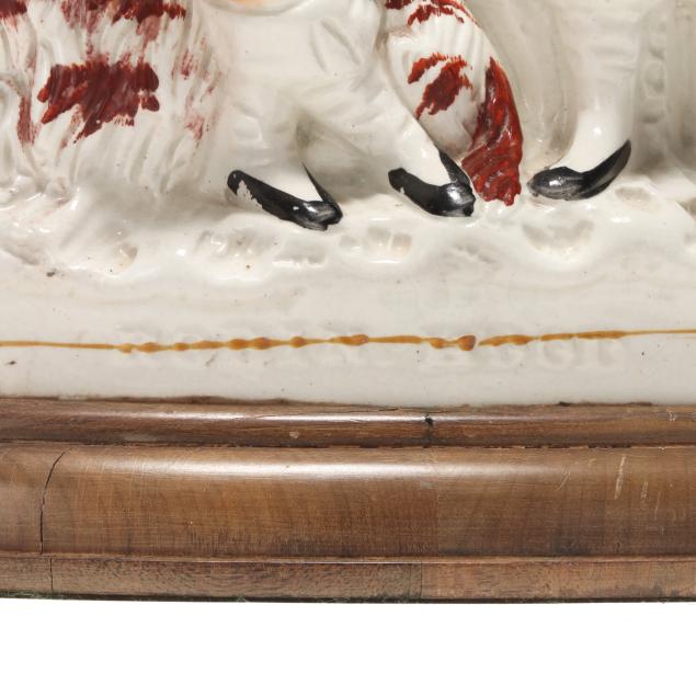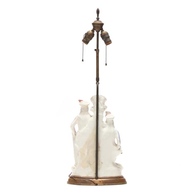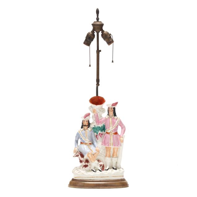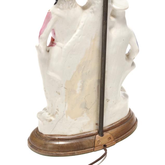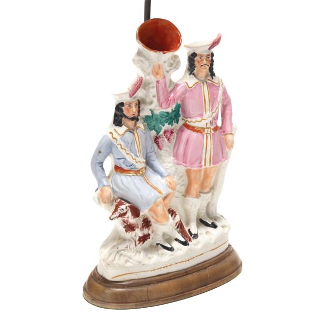 From the Estate of the late Peggy Augustus, Old Keswick, Virginia Working at time of evaluation; large area of break and repair to back, break and repair with associated restoration to hat of standing figure, restoration to dog's mouth, nicks to rim of vase, scattered hairlines, and a few small areas of paint loss to Staffordshire spill vase; shade no longer lined; a few cracks to wood base.
