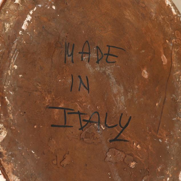 Mid-20th century, tin glazed and hand-painted earthenware jar with closed spout to base and two lion's head ring pulls, labeled "S[Christian cross]A/VIN SANTO" to body and "1688" to posterior, marked "MADE IN ITALY" to underside.
