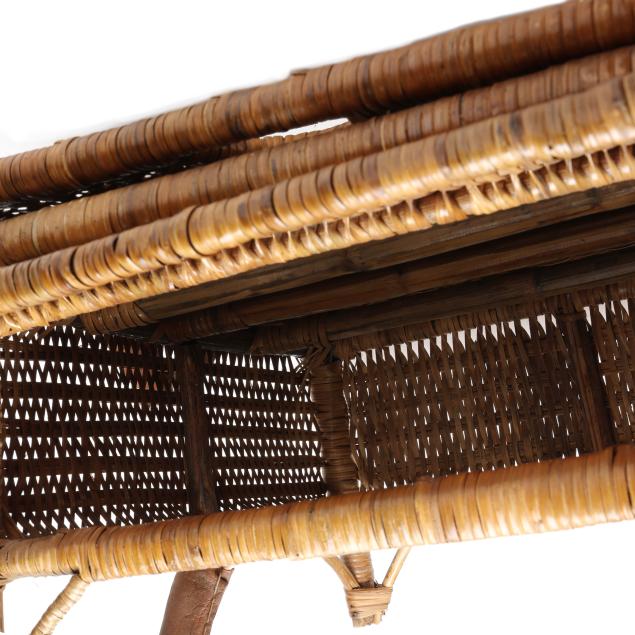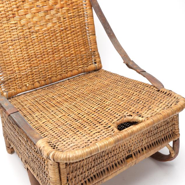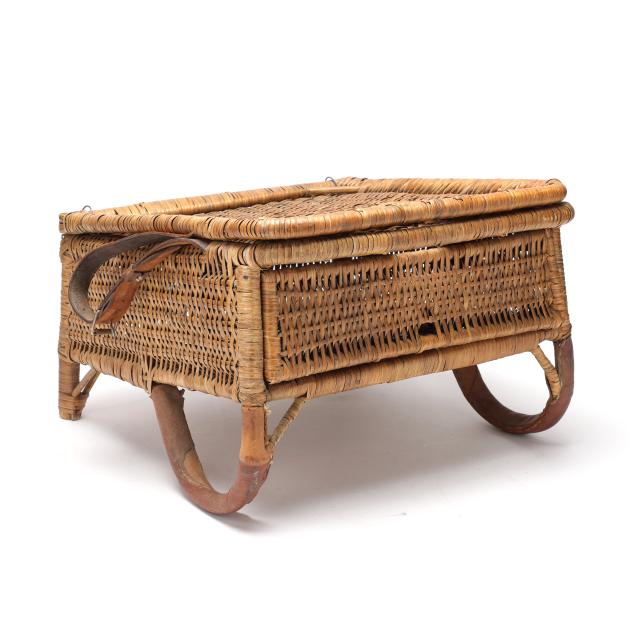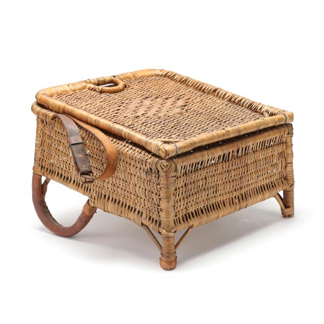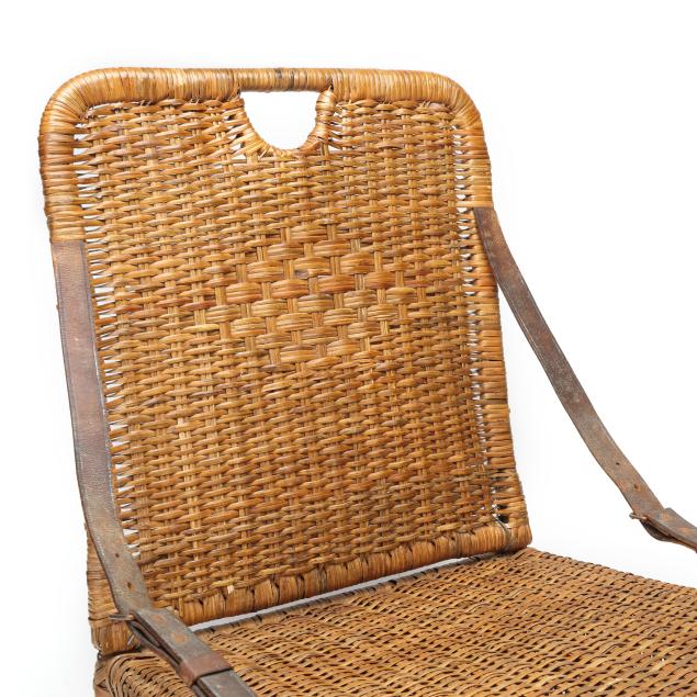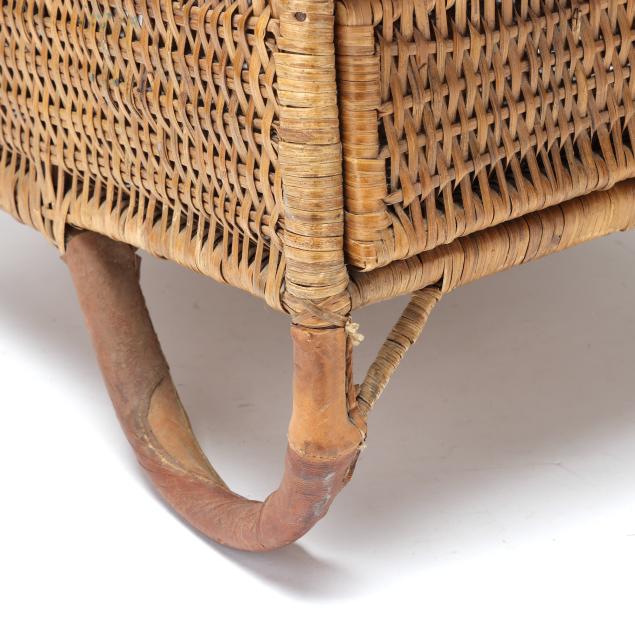 Circa 1950s, natural wicker seat, folding backrest and lower storage compartment with folding lid, leather straps, leather wraps around feet, unmarked.