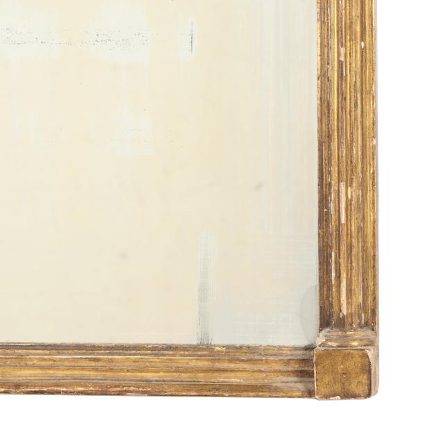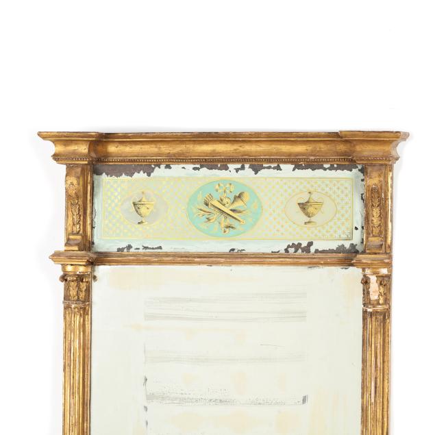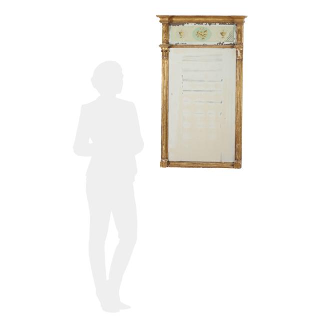 19th century, French or English, architectural gesso and giltwood frame, featuring a beaded cornice supported by acanthus corbels, flanking an eglomise panel with mint and gilt diapered ground, centering an oval medallion festooned with quiver, torch, and doves between two urns, unmarked, over a rectangular mirror bordered by fluted half columns.