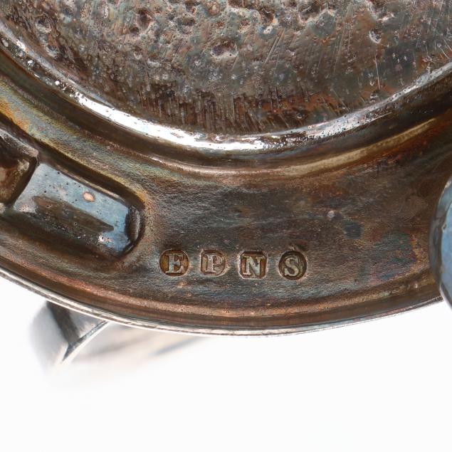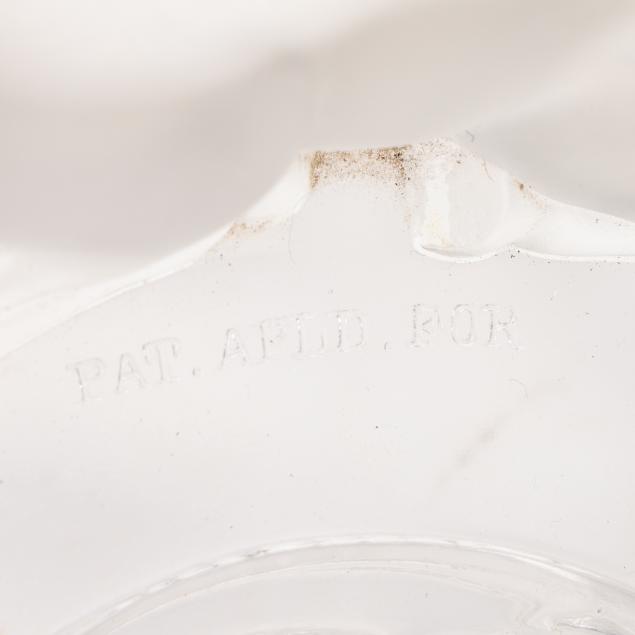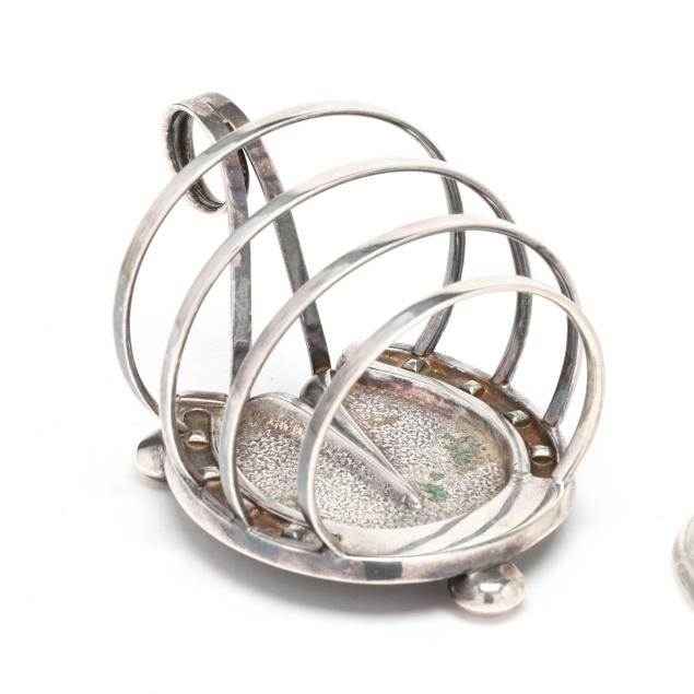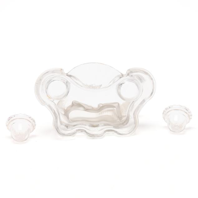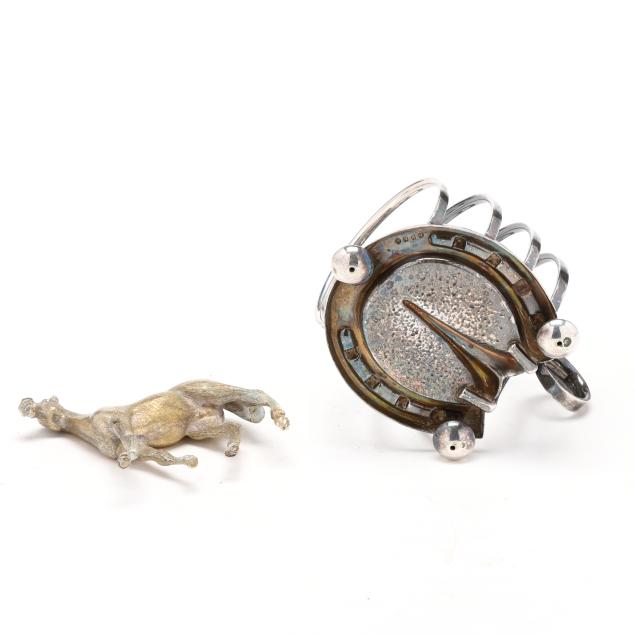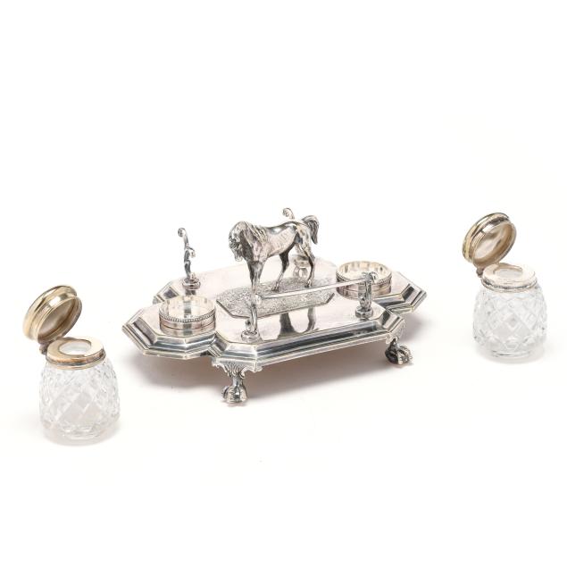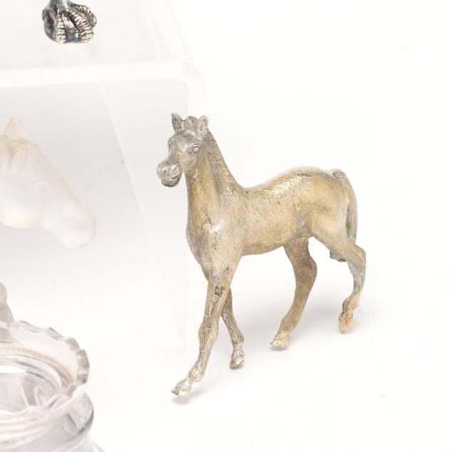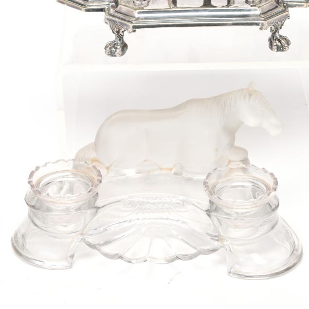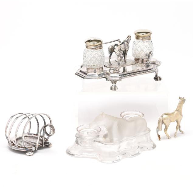 The first a silver-plated standish with well cast standing sculptural horse to the center of the medallion form terrace, with two scrolled pen stands and two cut crystal inkwells, raised on talon and ball feet, unmarked (4 1/4 x 6 x 8 1/2 in.); the second a glass standish featuring a recumbent horse flanked by two removable inkwells and shell form tray, with embossed mark to underside "PAT. APLD. FOR" (4 1/4 x 8 x 5 in.); the third an Edwardian silver-plated toast rack or letter stand in the form of a horseshoe and hoof, stamped EPNS and "26107" to the underside (5 1/2 x 5 x 3 1/2 in.); together with a cast and gilt metal horse ornament, unmarked (3 3/4 in.).