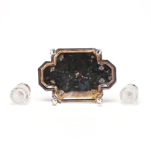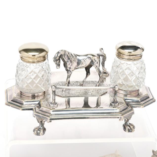From the Estate of the late Peggy Augustus, Old Keswick, Virginia Areas of bleed, light scratches, and some polish residue to plating; inkwell interiors with residue and lids with denting; ornament no longer retaining base; glass horse with chips to ear tips.