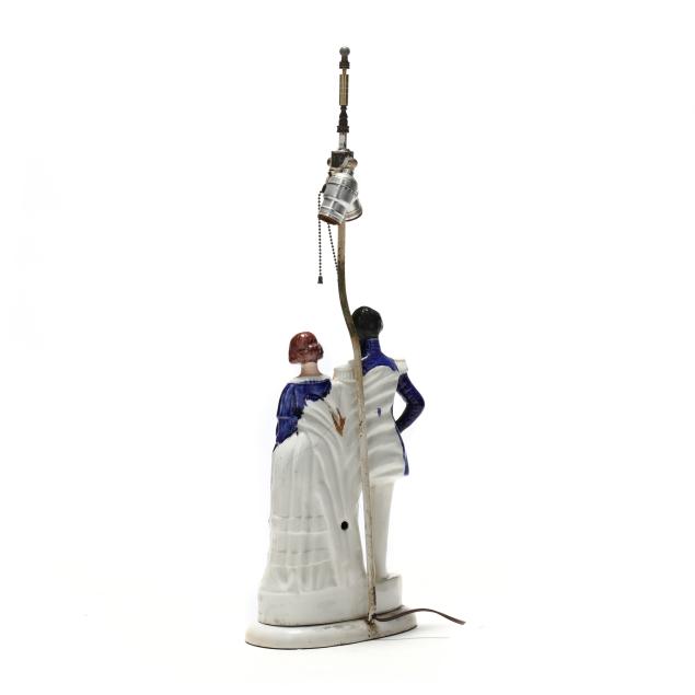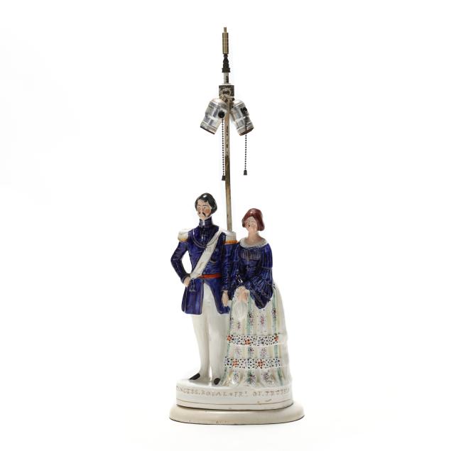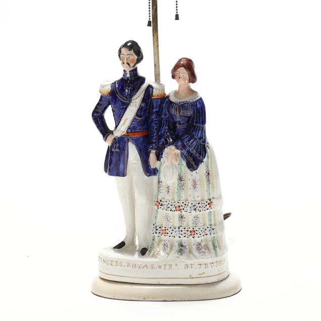 England, mid-late 19th century, hand-painted and gilt flatback pearlware grouping of the Princess Royal and Frederick of Prussia, now fitted as a two-light form table lamp with white painted wood base, includes silk shade with red and white thread trim and brass finial, unmarked.