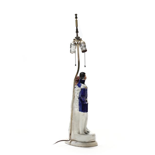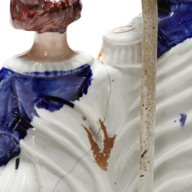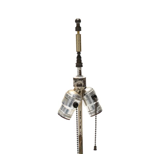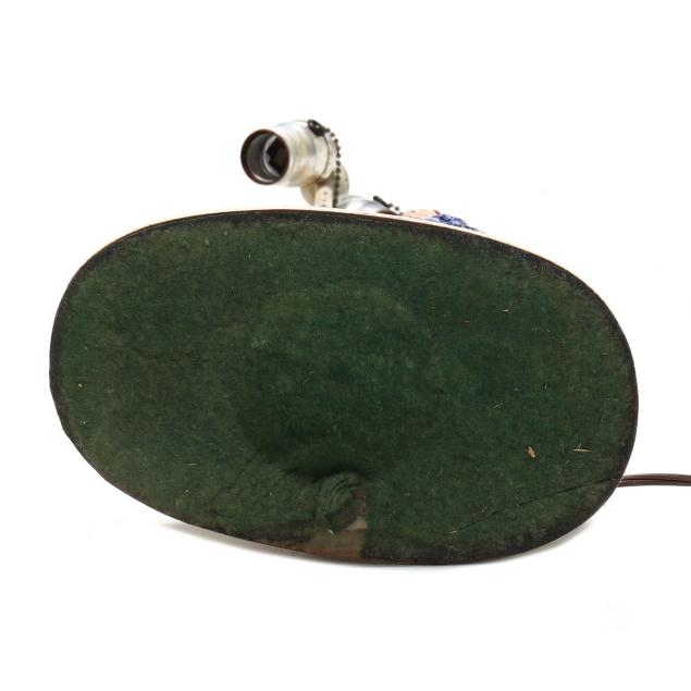 From the Estate of the late Peggy Augustus, Old Keswick, Virginia Working at time of evaluation; hairline and surface abrasion to posterior, a few small abrasions to faces of figure; shade no longer lined, with a few small tears, and staining; paint loss to wood base and metal tube.