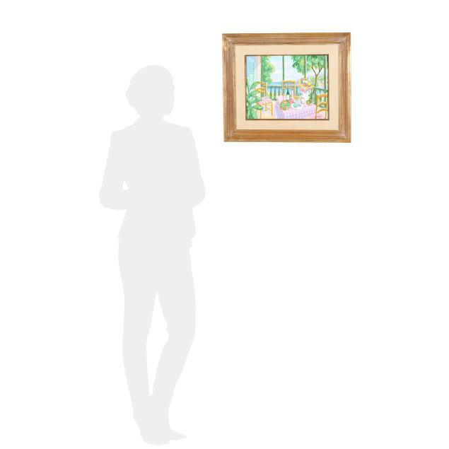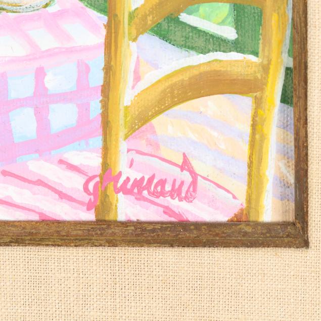 From the Estate of the late Peggy Augustus, Old Keswick, Virginia William Grimaud is a painter trained at the University of Edinburgh, the Slade School in London, the Sorbonne in Paris, and in Spain. Working in a Post-Impressionist style, he is known for colorful still lifes, interiors, landscapes, and figure studies, often using bold line and textured brushwork.