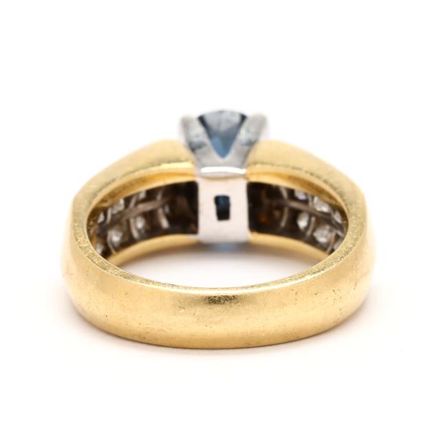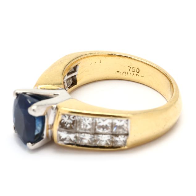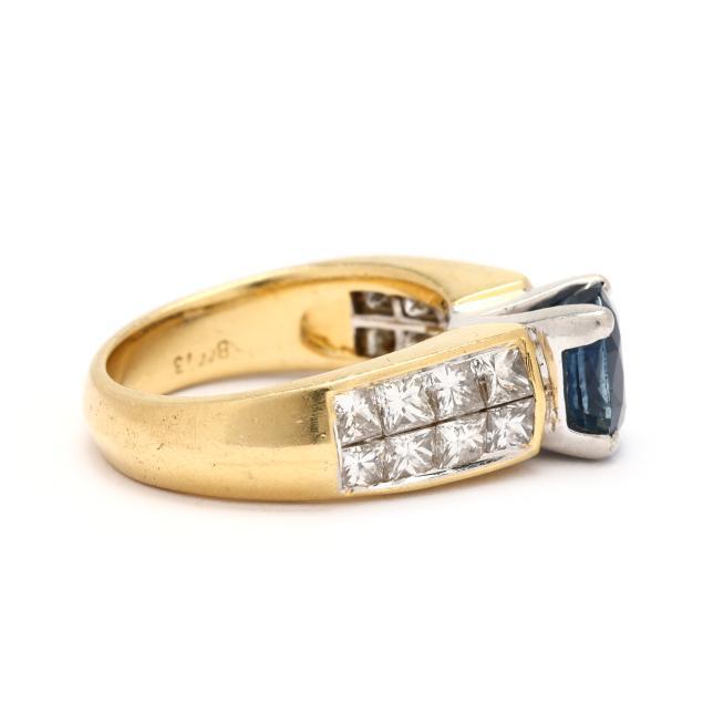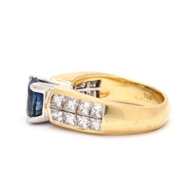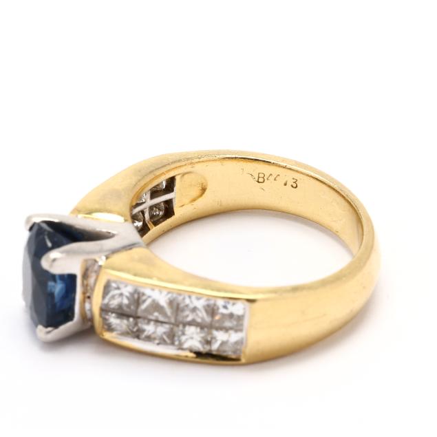 Centered on a prong set oval cut sapphire (9.0 x 7.0mm) weighing approximately 2.40 carats, the shoulders channel set with princess cut diamonds wearing approximately 1.56 total carats (H-I color, VS2-SI1 clarity), stamped 750, with a maker's mark, and with a number.