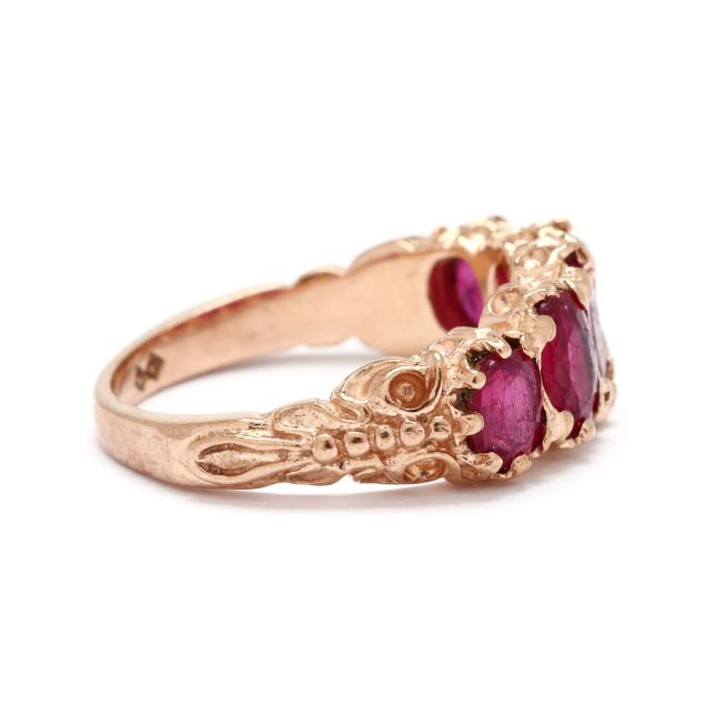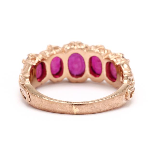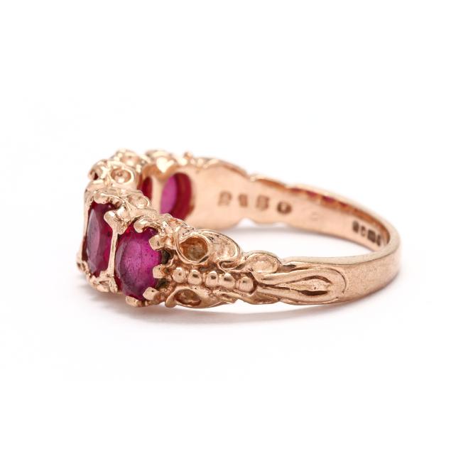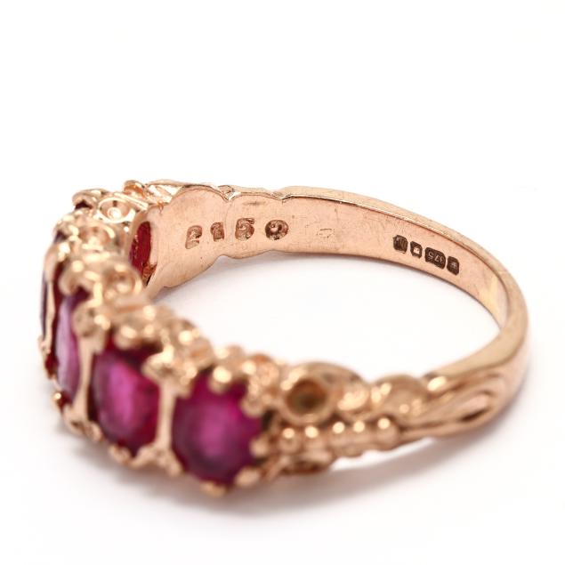 Gold band set with five graduated oval cut rubies (5.0 x 4.0mm - 7.0 x 5.0mm) with scrolled detailing, stamped with London hallmarks for 9KT gold, with goldsmith's mark AK.