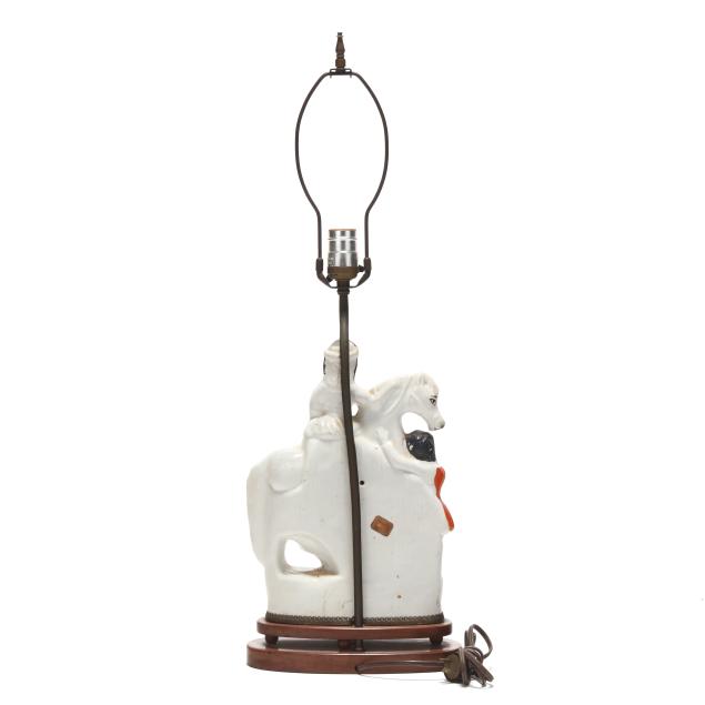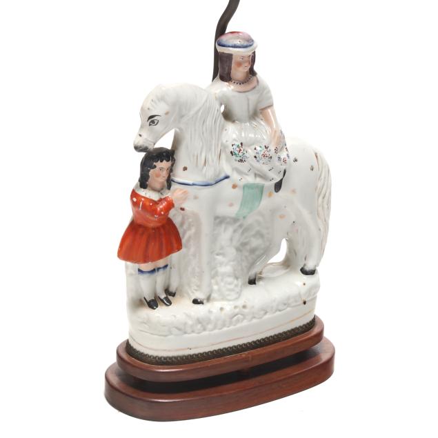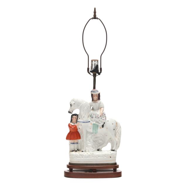 England, mid-late 19th century, hand-painted and gilt flatback pearlware figural grouping, now fitted as a table lamp with reticulated brass trim and two-tiered wood base, includes paper shade with blue painted paper trim and brass finial, unmarked.