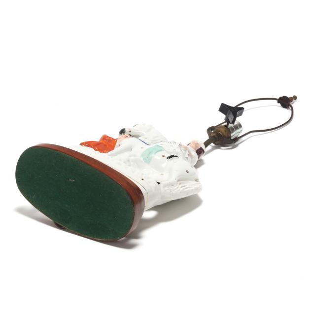From the Estate of the late Peggy Augustus, Old Keswick, Virginia Working at time of evaluation; a few hairlines and firing cracks, small areas of paint loss and gilt rubbing, aged label adhered to posterior, scuff from lamp tube to back of girl's head in figural grouping; a few small stains to shade, area of loss to trim; dust soiling to crevices.
