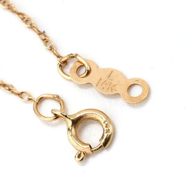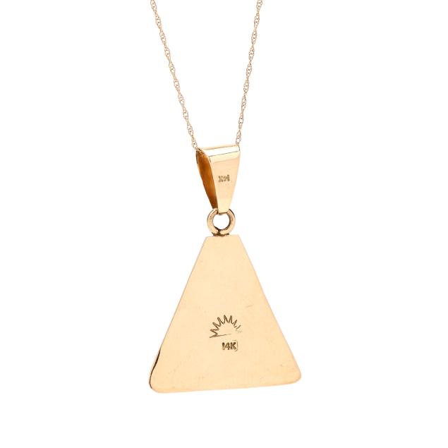 The gold triangular pendant with inlaid turquoise, completed with a bail, stamped with a maker's mark and 14K, suspended from a gold rope pendant chain, completed with a spring ring clasp, stamped L / 14K.
