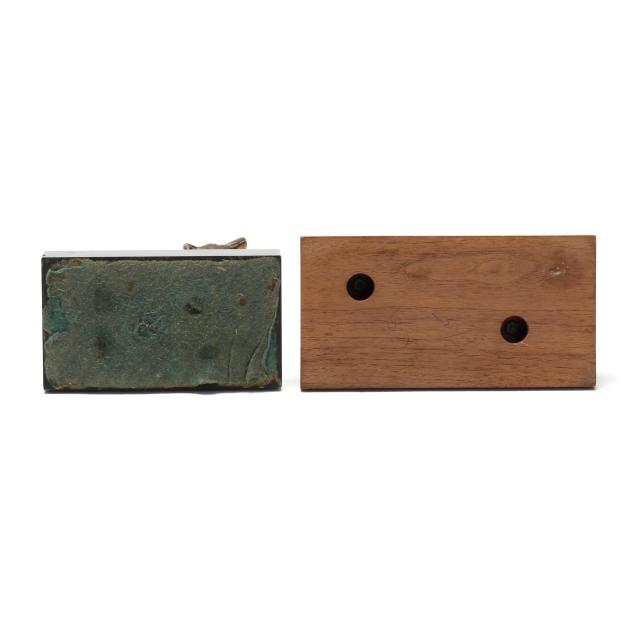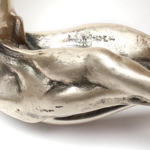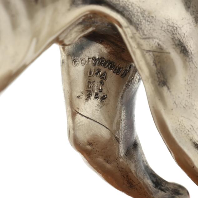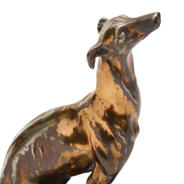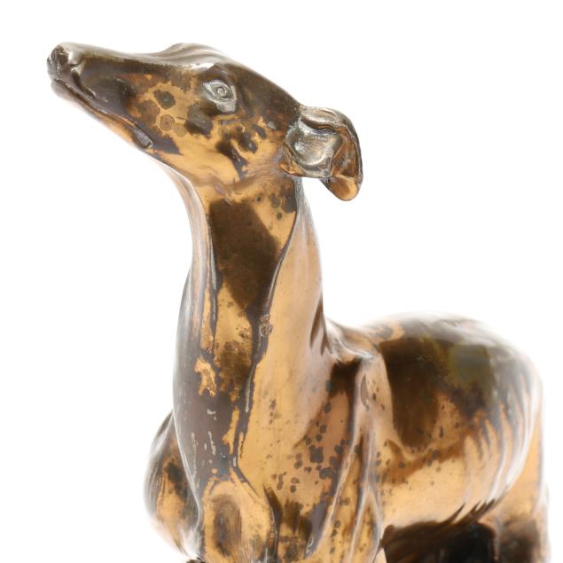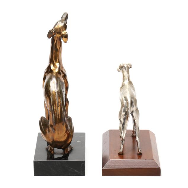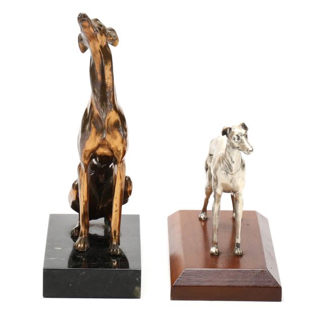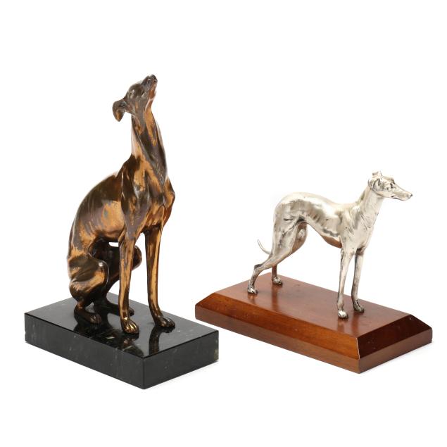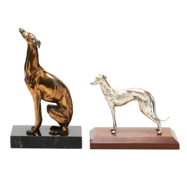 First half 20th century, the first a silver-plated metal model in standing form by Alfred J. Flauder (Austrian/American,1887-1977) for Weidlich Brothers, signed "A FLAUDER" embossed mark "COPYRIGHT / U.S.A. / "WB" [within a shield] / 2292," mounted atop a walnut base (6 3/4 in.); the second cast as a seated hound in gilt metal, mounted atop a green marble base, unmarked (10 7/8 in.).