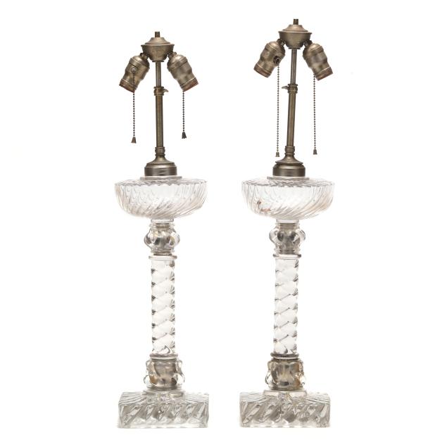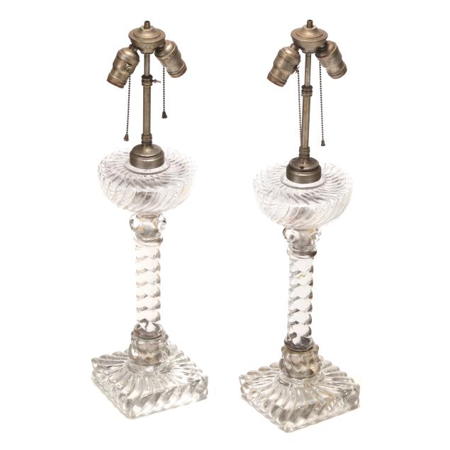 French, late 19th century, spiral reeded glass banquet oil lamps now electrified as two-light form table lamps with silvered brass mounts, includes silk lined shades with wood ball trim and brass finials, unmarked.