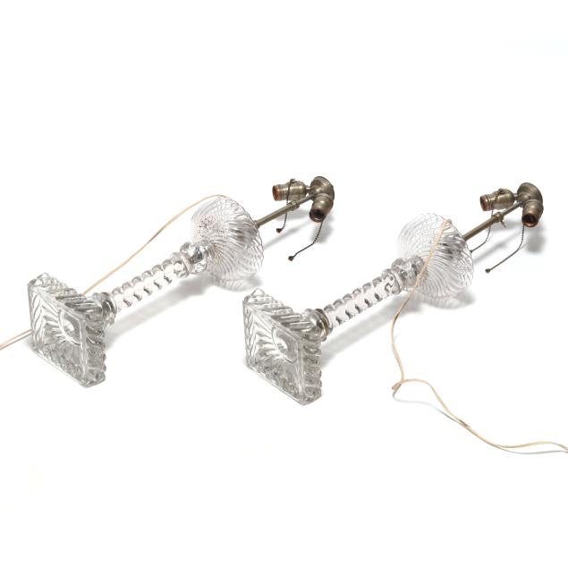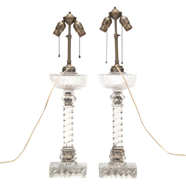 From the Estate of the late Peggy Augustus, Old Keswick, Virginia Working at time of evaluation; both lamps with looseness to glass components, fleabites to base, and residue trapped to interior of glass element; one lamp with cracks to square base; the other lamp with dried adhesive residue between two glass elements and chip to another glass element; both shades with losses to silk lined wooden ball trim, small tear to lining of one trim.