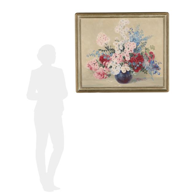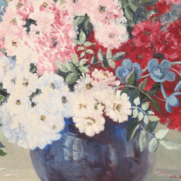 Iris and Peonies was acquired for the Indiana Governor’s Mansion. She also taught art and fostered young talent from her home in Brown County. Even after a stroke left her partially blind, she continued to paint, later gifting a peony still life to the state of Indiana in honor of its state flower.