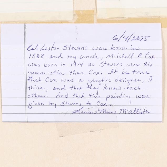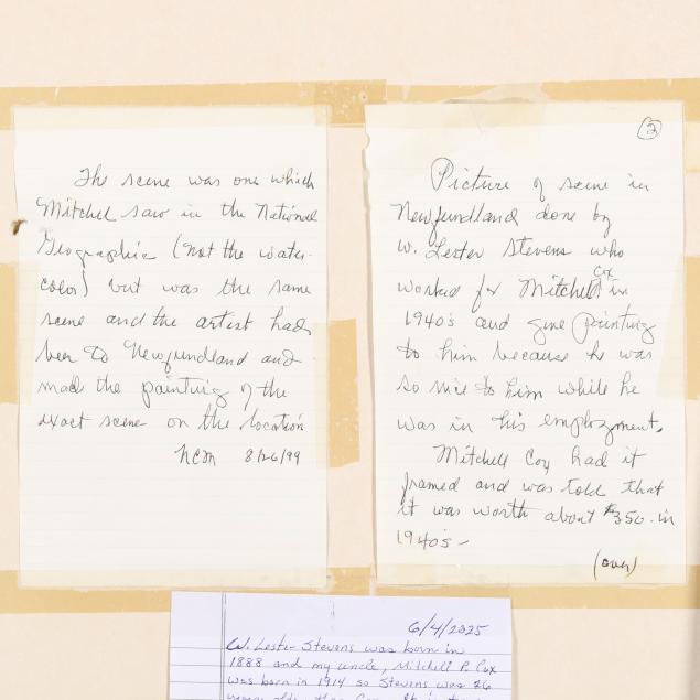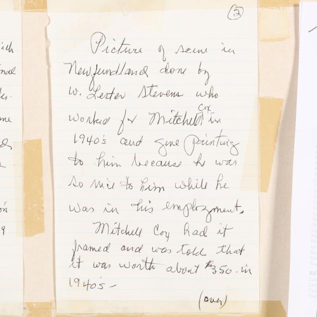According to the written history accompanying this painting, Stevens painted this work in Newfoundland, Canada. The artist was briefly employed by William P. Cox while working in North Carolina in the 1940s. Stevens gifted the work to his employer out of gratitude for his employment and kindness.