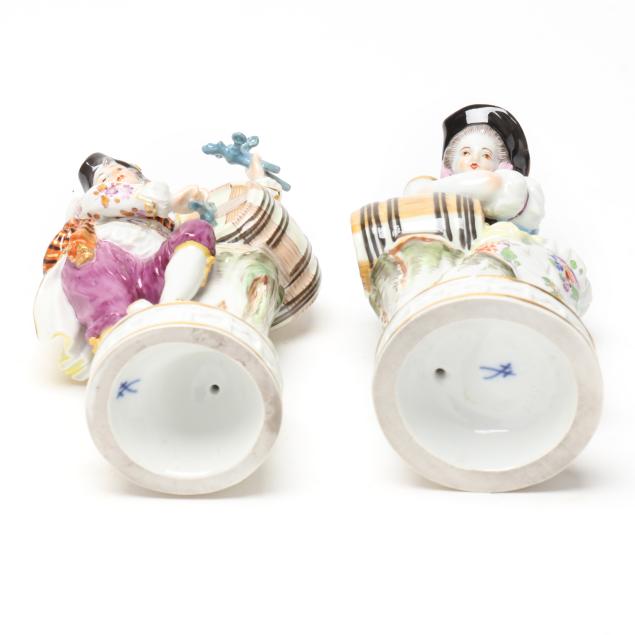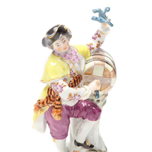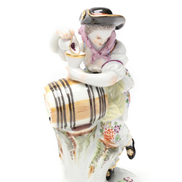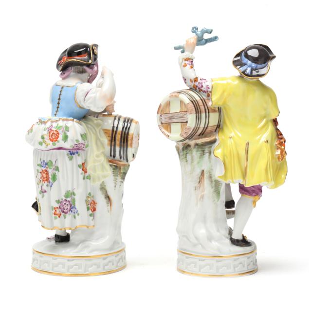 Germany, circa early 20th century, hand-painted and gilt porcelain figurines of wine growers with cask, after model by Michel-Victor Acier (1736-1799), including a male and female wine grower with cask, both with underglaze blue crossed-swords marks and incised "F.80" model number to underside.