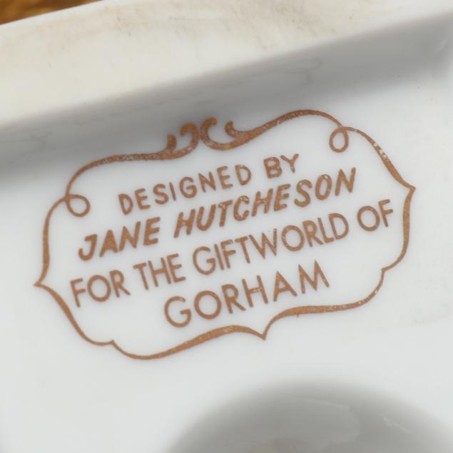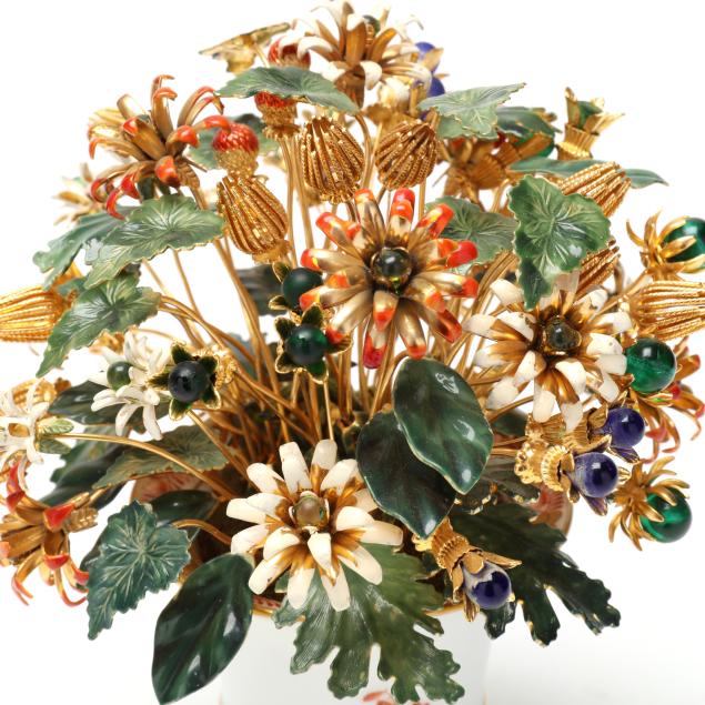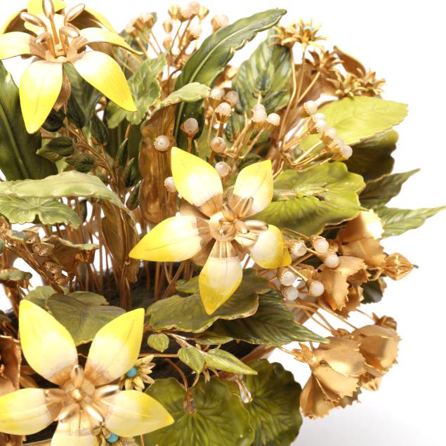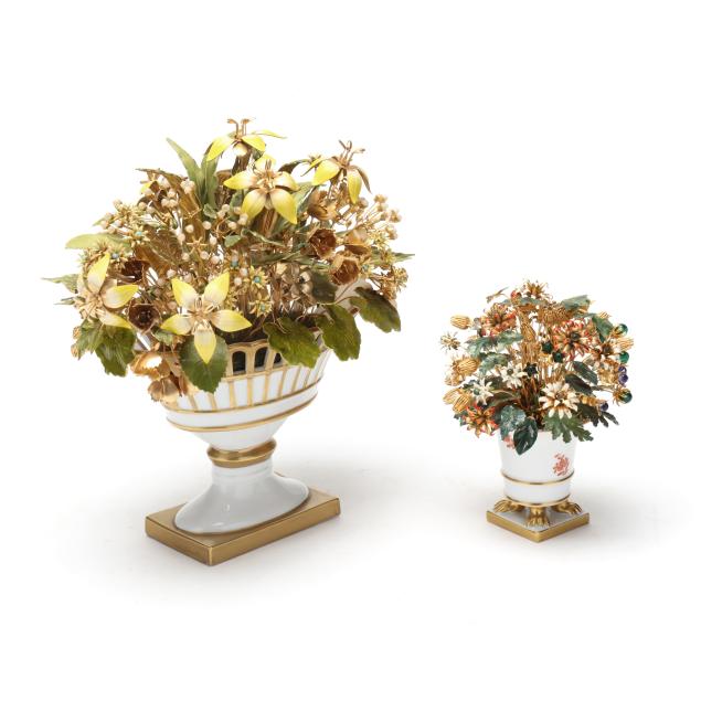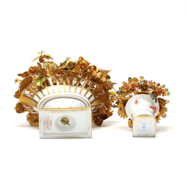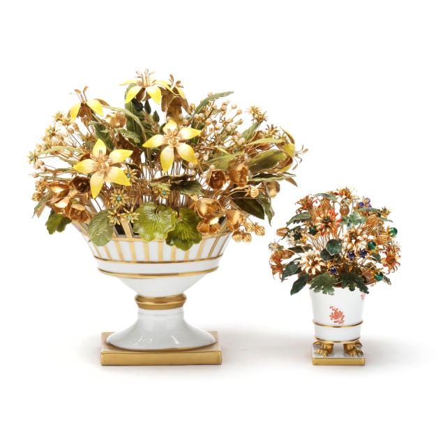 The first, designed by Jane Hutcheson for Gorham set in a gilt porcelain vase with reticulated rim, marked to underside (10 1/2 in.); the second, also likely designed by Hutcheson, set within a Herend #6404