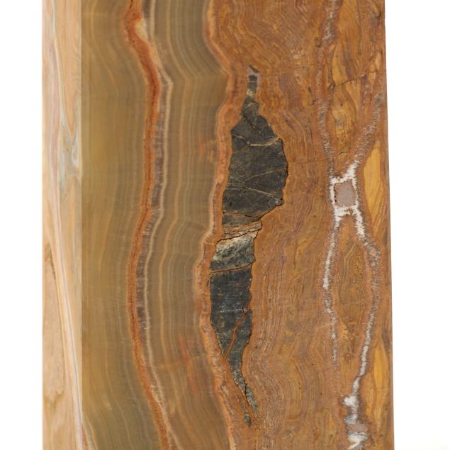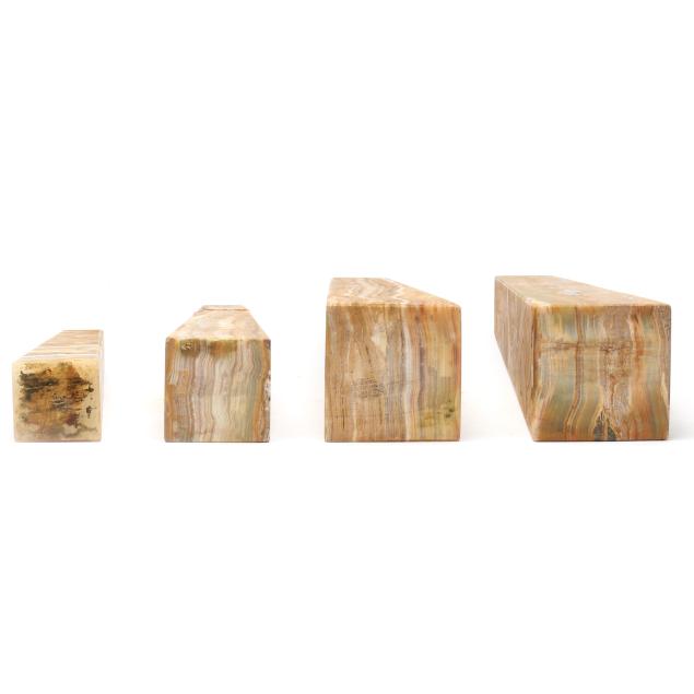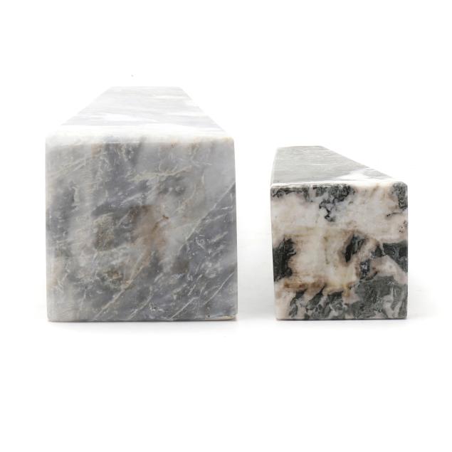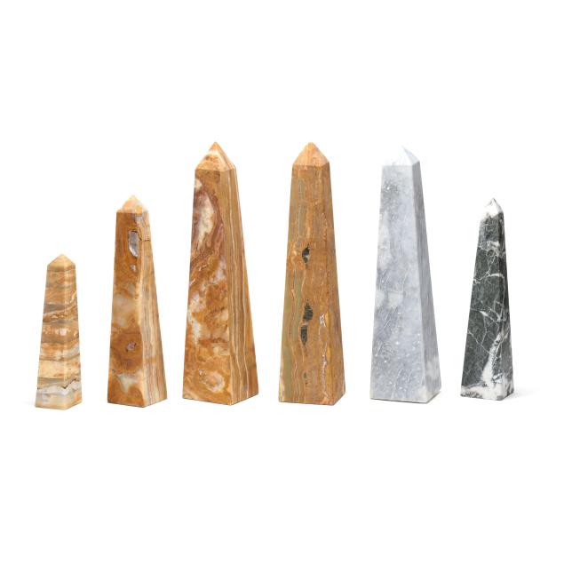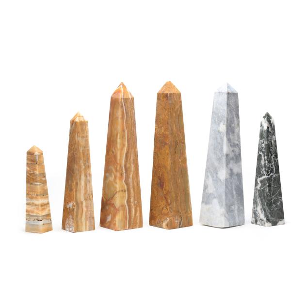 All with polished matte finish, including (4) sand onyx obelisks, the smallest in stacked form; and (2) gray marble obelisks.