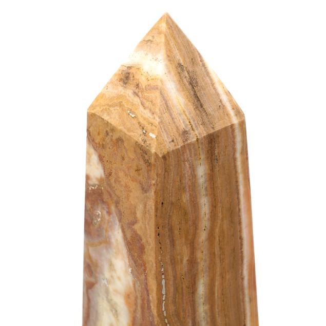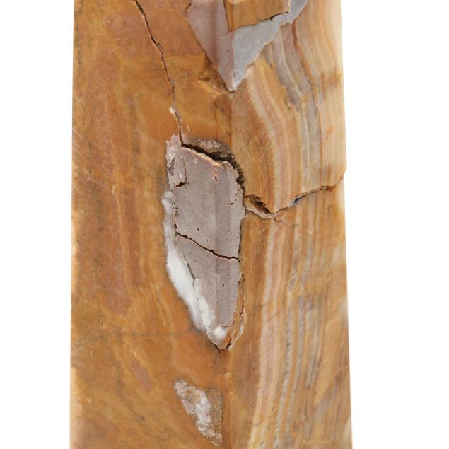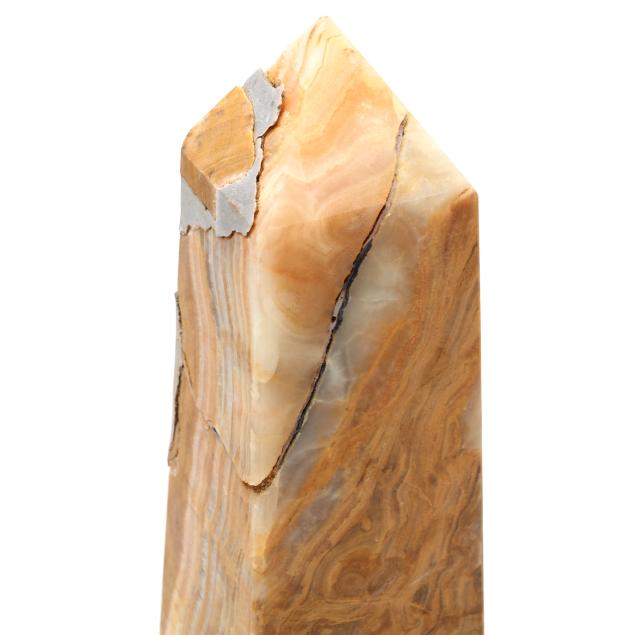 From the Estate of the late Lynette G. Totten, Butner, North Carolina Chip to top and two breaks with repair to one larger sand onyx obelisk; breaks and repair to top of medium size sand onyx obelisk; smallest sand onyx obelisk with possible break and repair to one corner towards top.