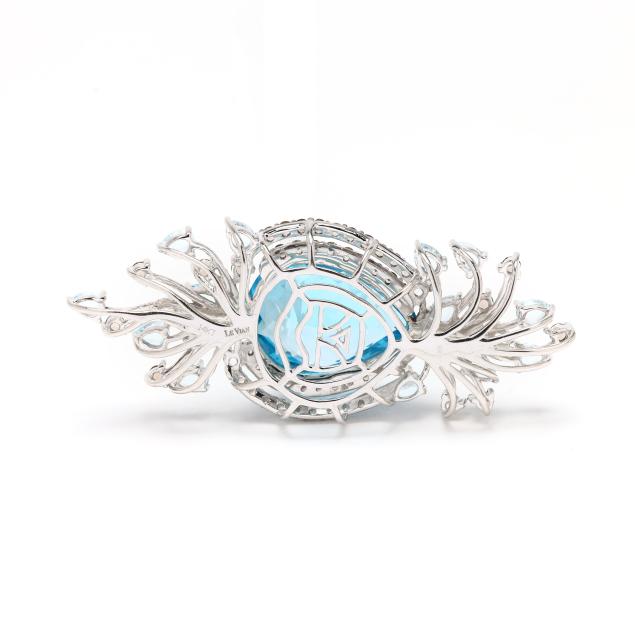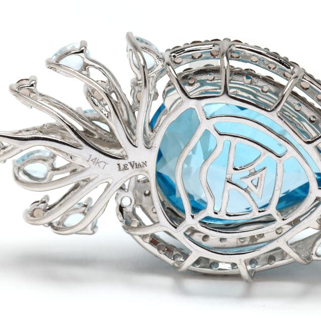 Centered on a pear checkerboard cut topaz (20 x 15mm) weighing approximately 19.0 carats, set to the sides with round cut smoky quartz melee, and set to the top and bottom with pear cut blue topaz and round cut smoky quartz in a foliate spray style, stamped 14KT / Le Vian.