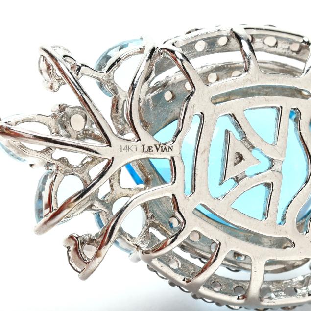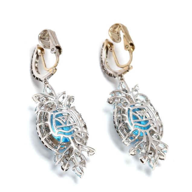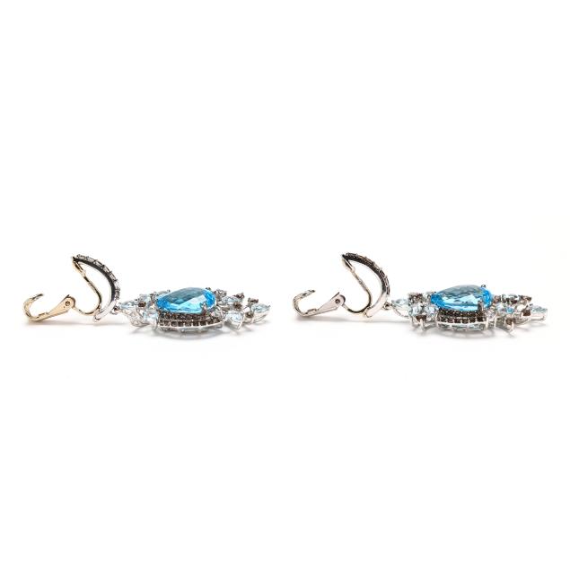 The hoop earring set with round cut smoky quartz, completed with ear clips, stamped 14K, and suspending a dangle centered on a pear cut topaz (14 x 10mm) weighing approximately 10.0 total carats, set to the sides with round cut smoky quartz melee, and set to the top and bottom with pear cut blue topaz and round cut smoky quartz in a foliate spray, stamped 14KT Le Vian.