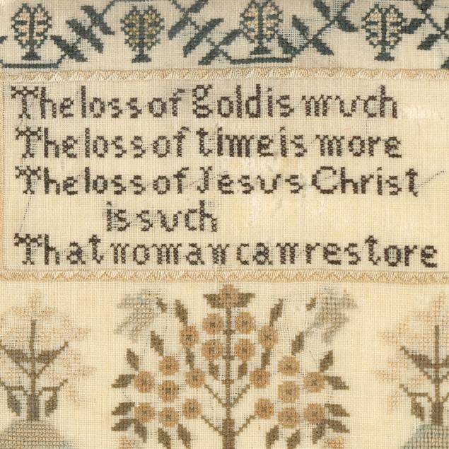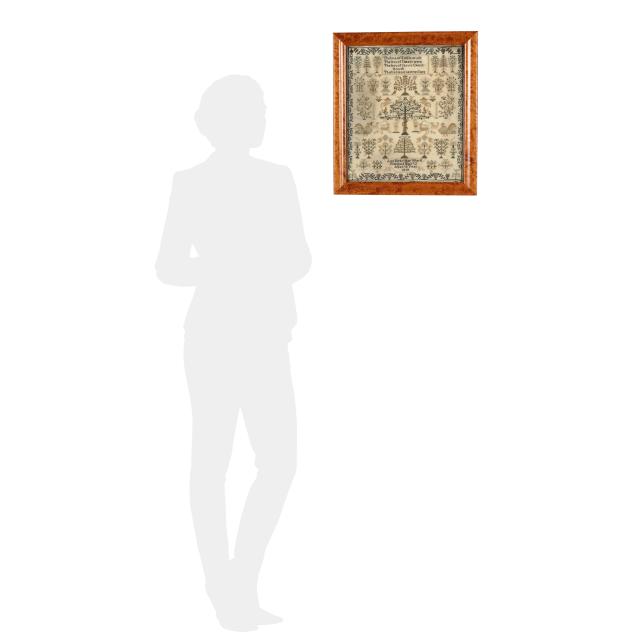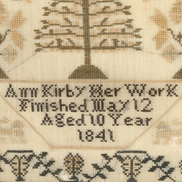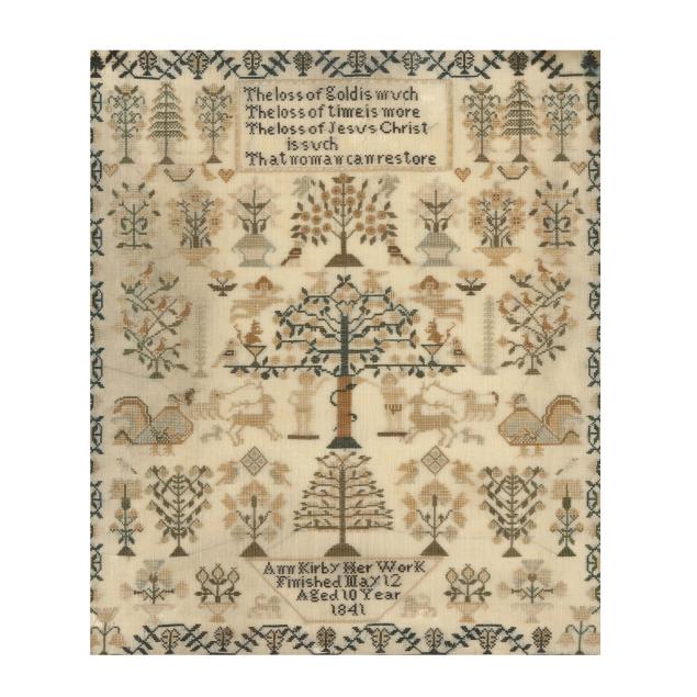 Silk on fine linen, worked primarily in cross-stitch, the upper register with pious verse: "The loss of gold is much / the loss of time is more / the loss of Jesus Christ / is such / that no man can restore," with central Adam and Eve motif surrounded by symmetrically placed detached motifs including flowering plants, baskets of flowers, trees, angels, animals, hearts, etc., the lower register stating "Ann Kirby Her Work / Finished May 12 / Aged 10 Year / 1841," the sides with trailing strawberry borders and the upper and lower edges with trailing foliate borders, framed under glass in birds-eye wood frame.