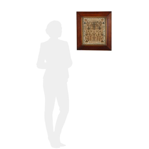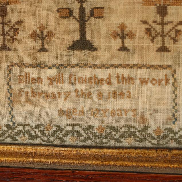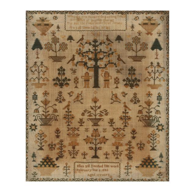 Silk on fine linen worked in cross stitch, England, with Adam & Eve below a fruiting tree surrounded by symmetrically placed flowering plants, baskets of flowers, trees, birds, stars, and butterflies, the upper register with verse from a hymn by Isaac Watts: "Why do we mourn departing friends / Or shake at deaths alarms / Tis but the voice that Jesus sends / To call them to his arms" and lower register stating "Ellen Till finished this work / February the 8 1842 / Aged 12 Years," with trailing flower-bud border, framed in thick antique wooden frame with gilded liner.