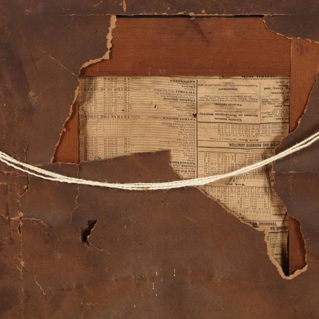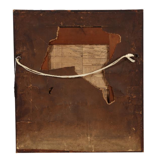 Fading; discoloration; small holes to linen; backing torn, revealing newsprint lining behind sampler; some scuffs to frame; not examined out of frame.