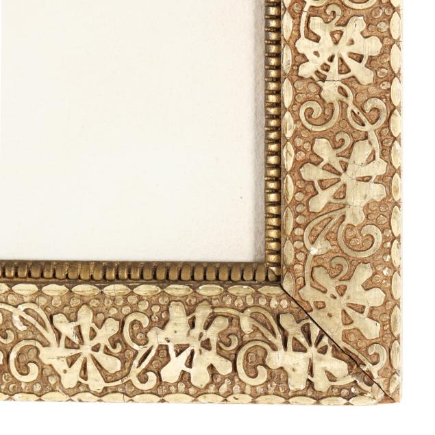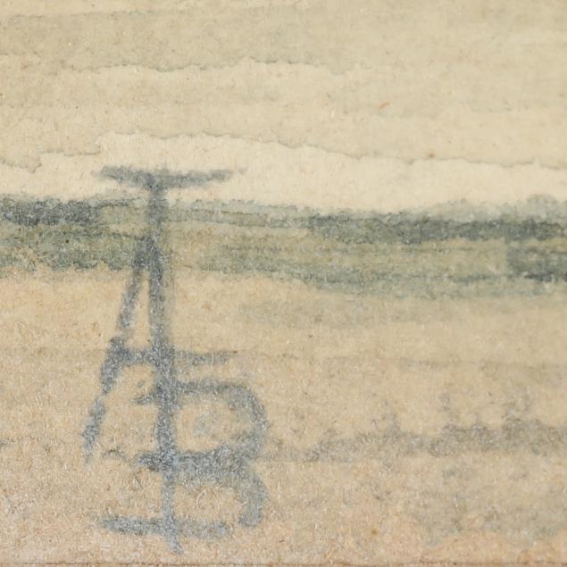 Watercolor on paper, signed with monogram at lower left, presented in a relief-carved frame below glass.