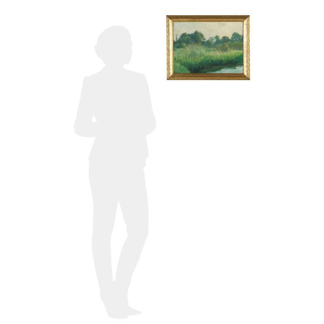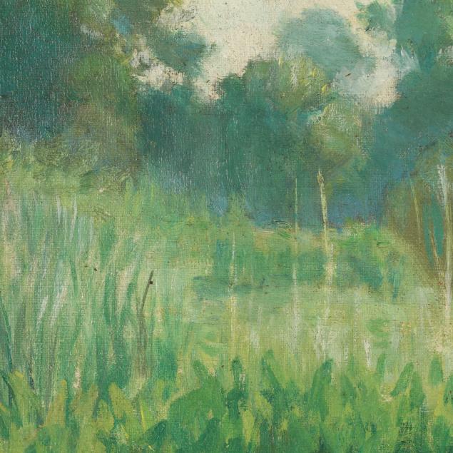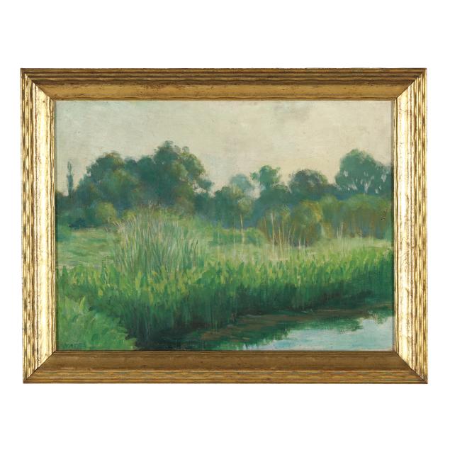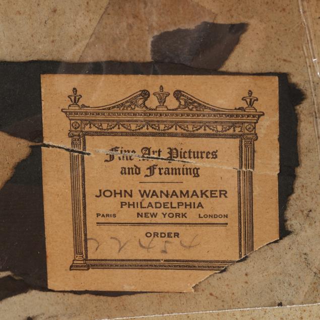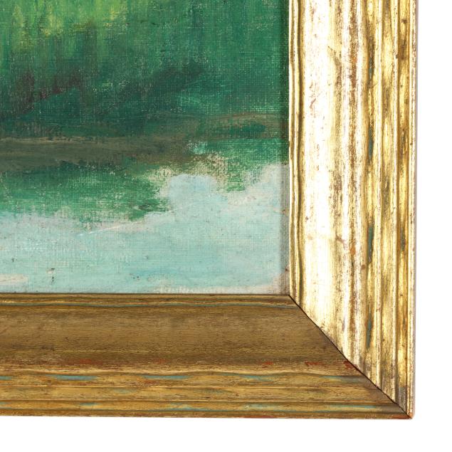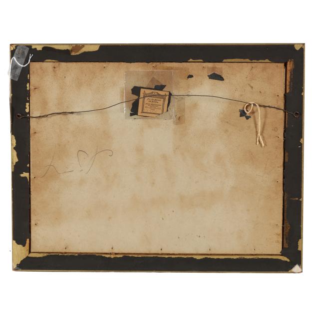 Oil on artist board, signed at lower left, retaining art supplier's label of John Wanamaker, Philadelphia to verso, presented in a period giltwood frame.