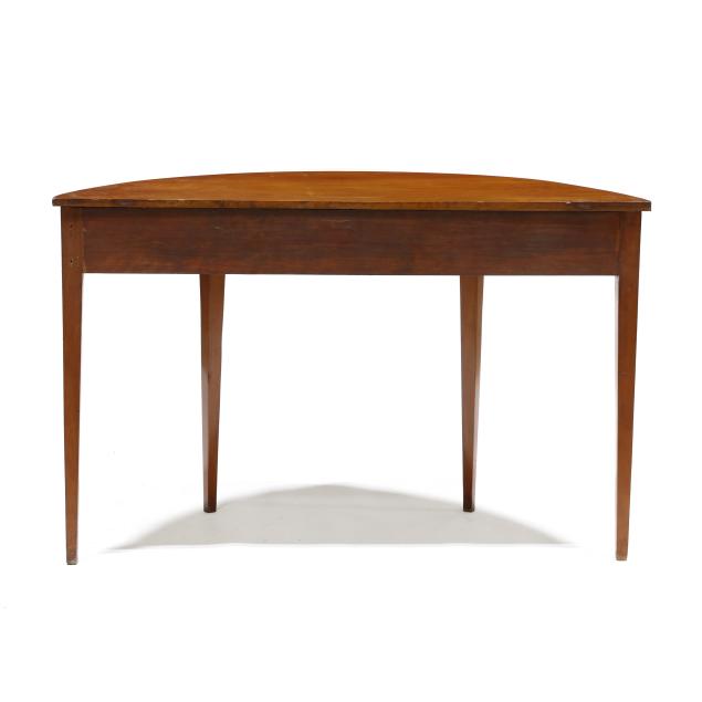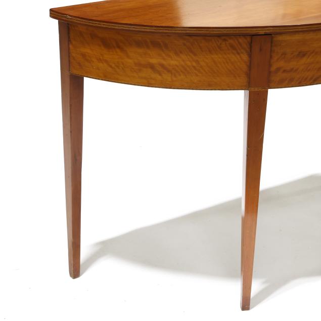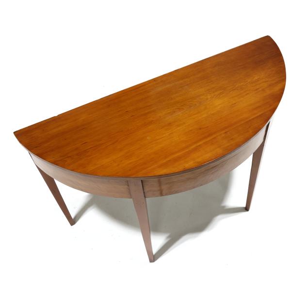 Early 19th century, cherry veneer, white pine and cherry secondary, the demilune form, the top edge with multi line and banded inlay, veneered skirt with stylized checkerboard inlay at bottom edge, four square tapered legs.