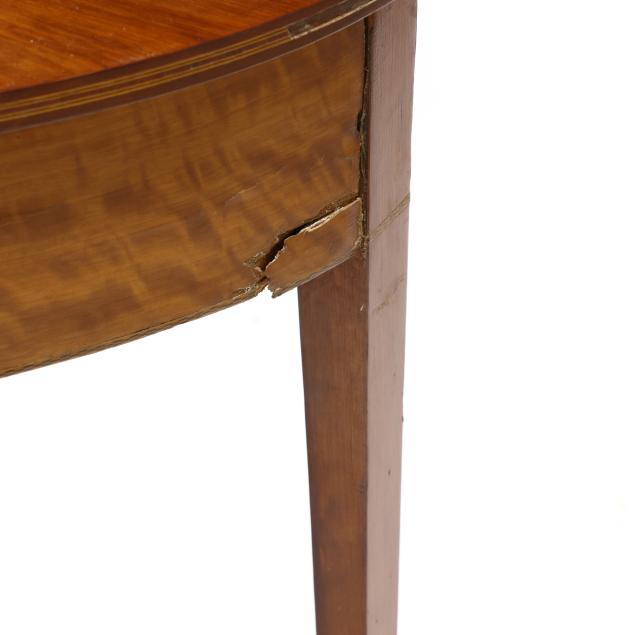 From the Estate of the late Peggy Augustus, Old Keswick, Virginia Front left leg tipped; right rear leg with break and separation at skirt; some veneer and inlay loss; table likely originally part of a banquet dining table.