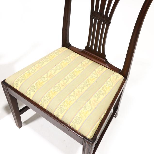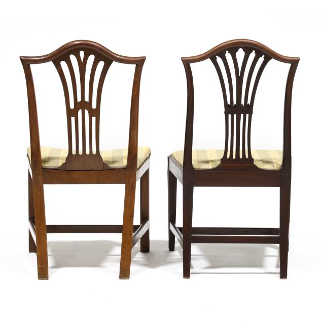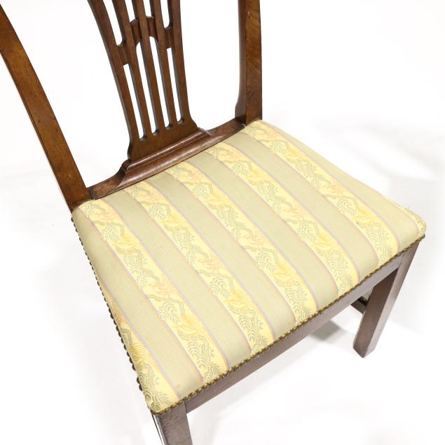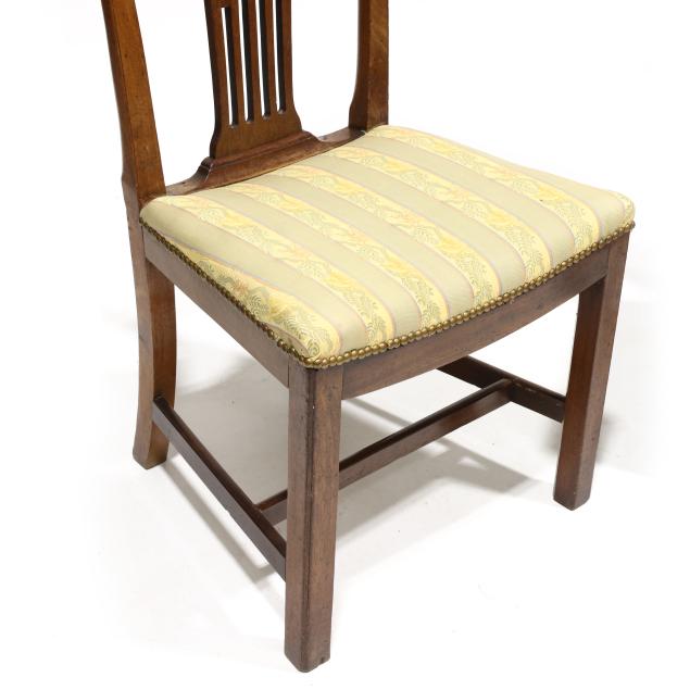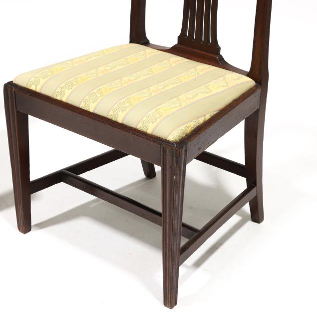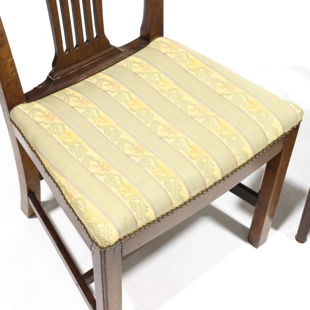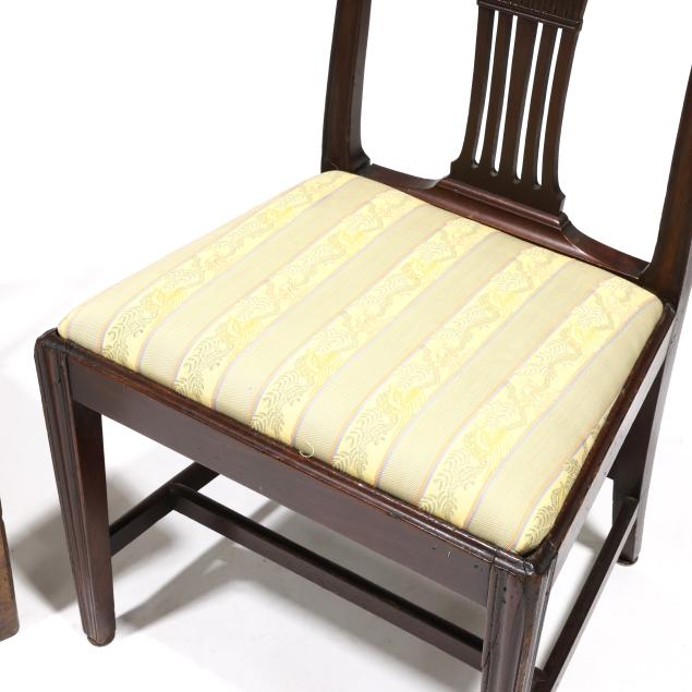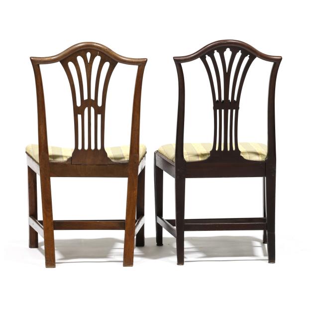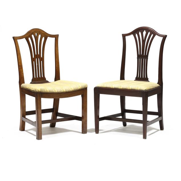 The first transitional late 18th century, featuring an arched crest and shaped stiles with scratch bead, pierced splat with upper teardrop, molded shoe, over upholstered concave seat with brass tack trim, straight front legs with molded corner and inside chamfer, flush stretcher base (37 x 21 x 19 in., seat height 18 in.); the second chair with a molded shaped crest rail and stiles, pierced splat with tobacco leaf relief carving at center of pierced splat, molded shoe, slip seat, molded flush seat rail, square tapered molded front legs, flush stretcher base (37.5 x 21 x 19 in., seat height 17 in.).
