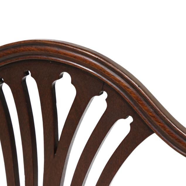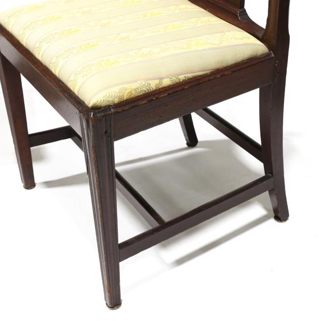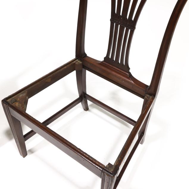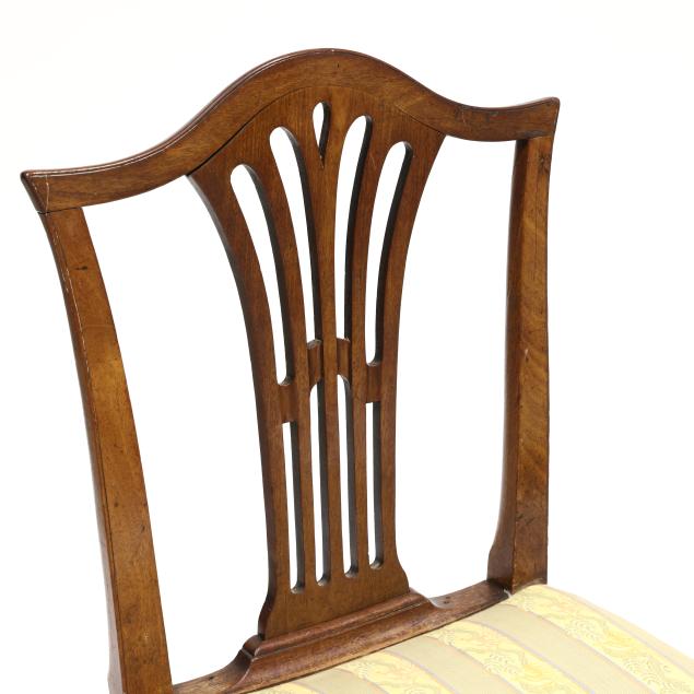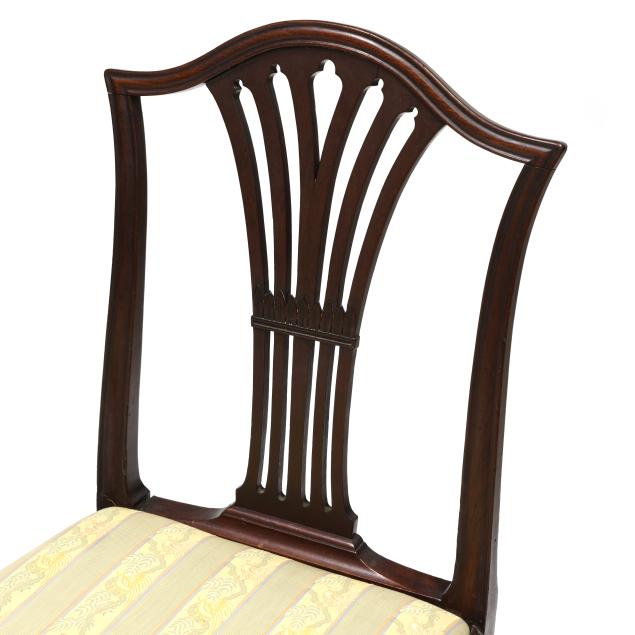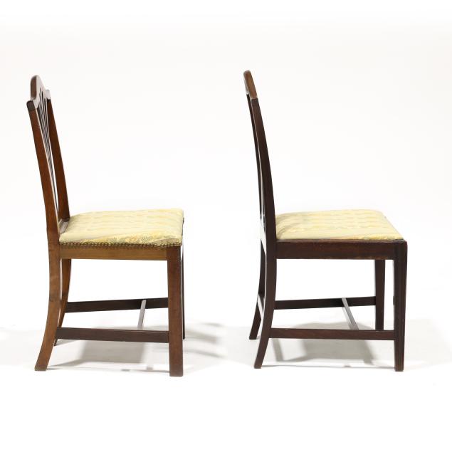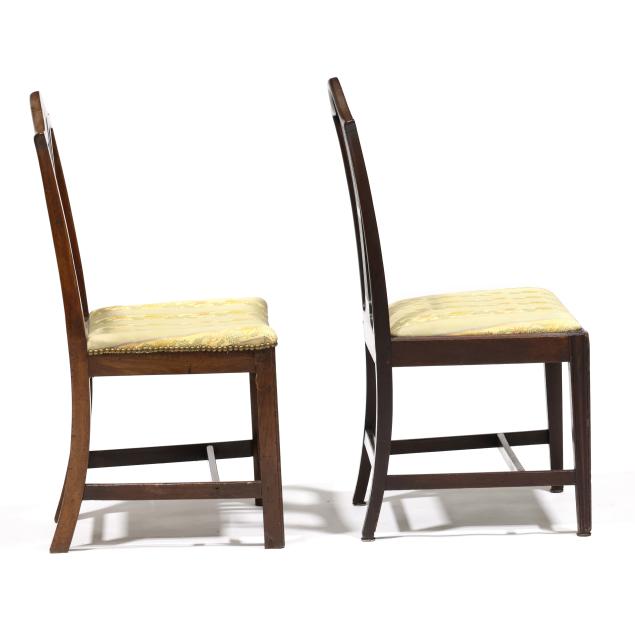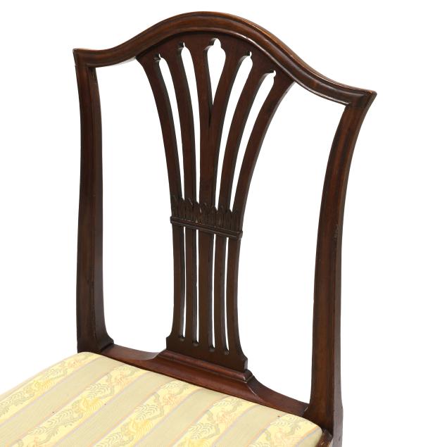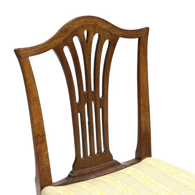 The first transitional late 18th century, featuring an arched crest and shaped stiles with scratch bead, pierced splat with upper teardrop, molded shoe, over upholstered concave seat with brass tack trim, straight front legs with molded corner and inside chamfer, flush stretcher base (37 x 21 x 19 in., seat height 18 in.); the second chair with a molded shaped crest rail and stiles, pierced splat with tobacco leaf relief carving at center of pierced splat, molded shoe, slip seat, molded flush seat rail, square tapered molded front legs, flush stretcher base (37.5 x 21 x 19 in., seat height 17 in.).