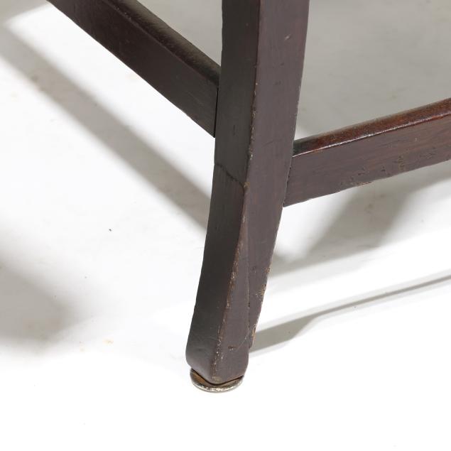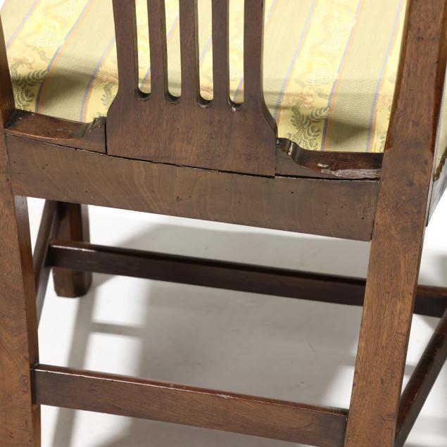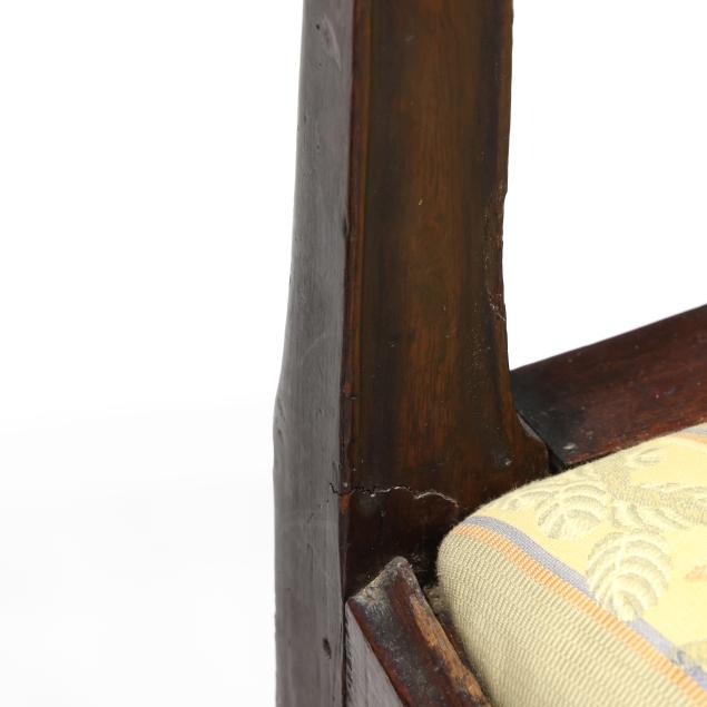 The second chair: retains an old dark surface; repair to upper left stile joint; repair at center stretcher by joint; split at right knee corner; break and repair to rear left leg at seat rail; later upholstery.