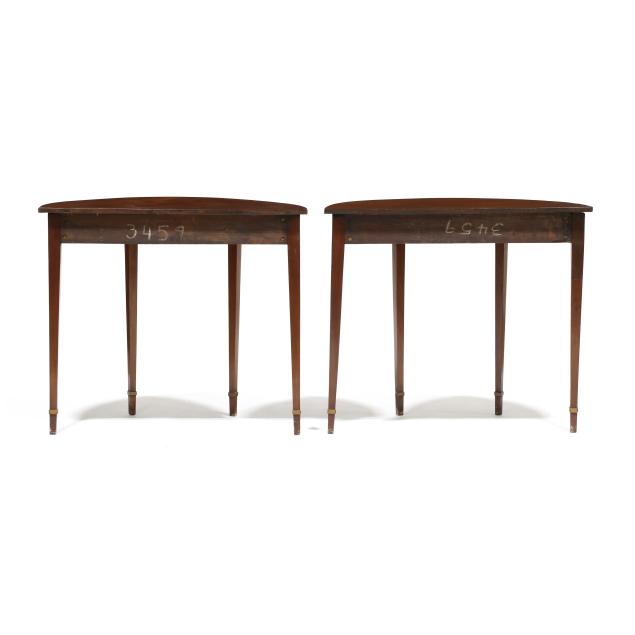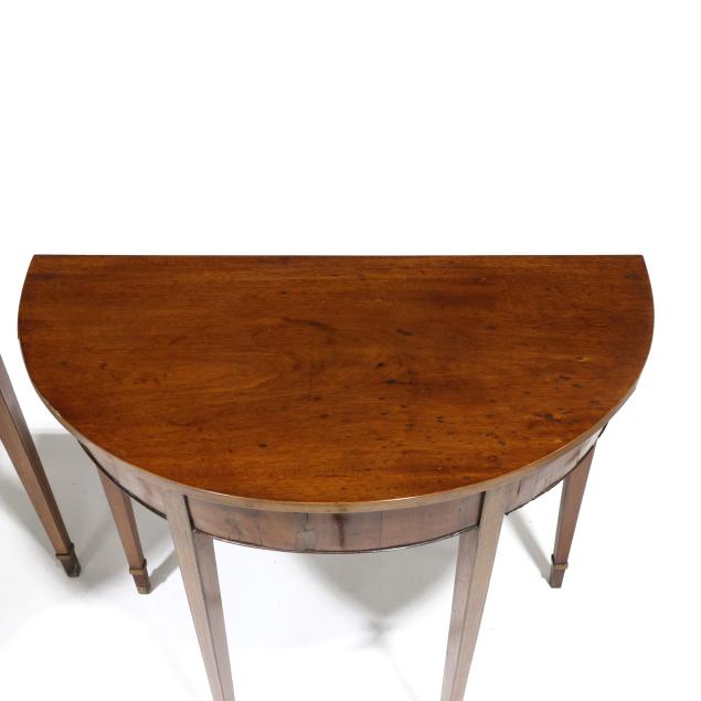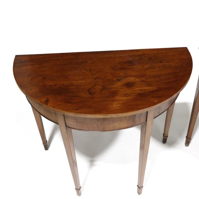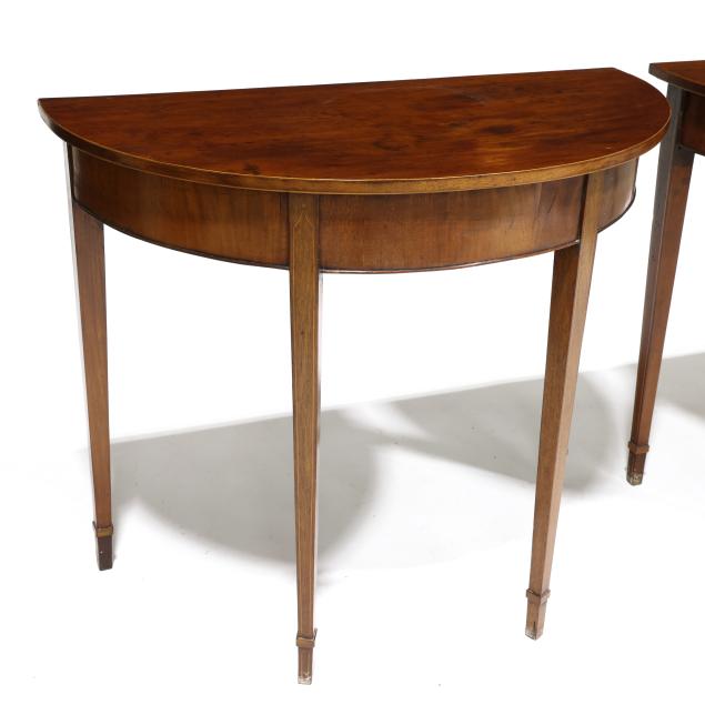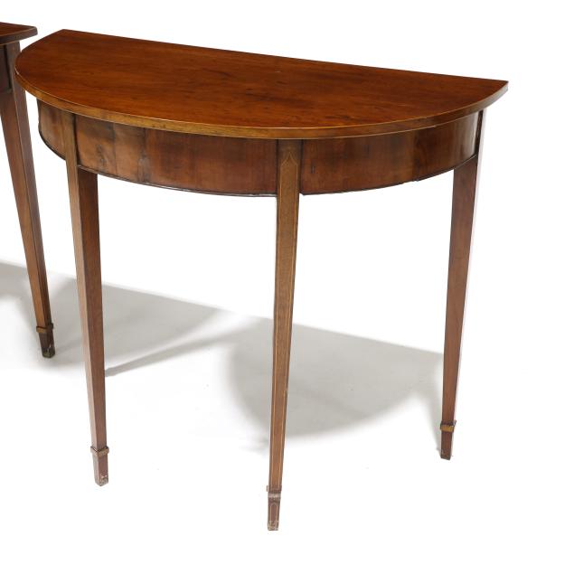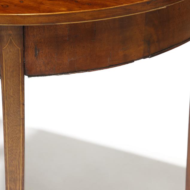 Circa 1800, white pine secondary, mahogany veneers, the demilune top with light wood inlays to upper and lower edge, veneered skirt with applied cock beading at bottom edge, tall square tapered legs featuring a light wood line inlay and distinctive dot inlay at top, applied lower cuff.