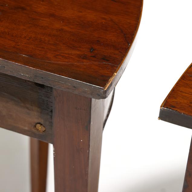 From the Estate of the late Peggy Augustus, Old Keswick, Virginia Dark staining and wear to top surfaces; minor inlay losses at edge; some shrinkage separation and minor repair at skirt; some cock beading loss to lower edge of skirt; one table the rear left leg with full cut and replacement to upper eight inches at corner where the skirt and rear rail meet; remnants of white chalk mark #3459.