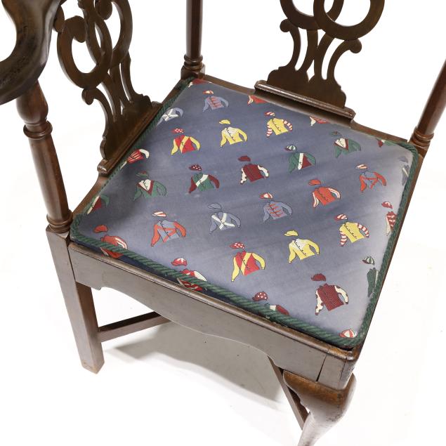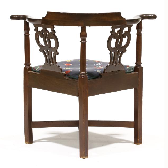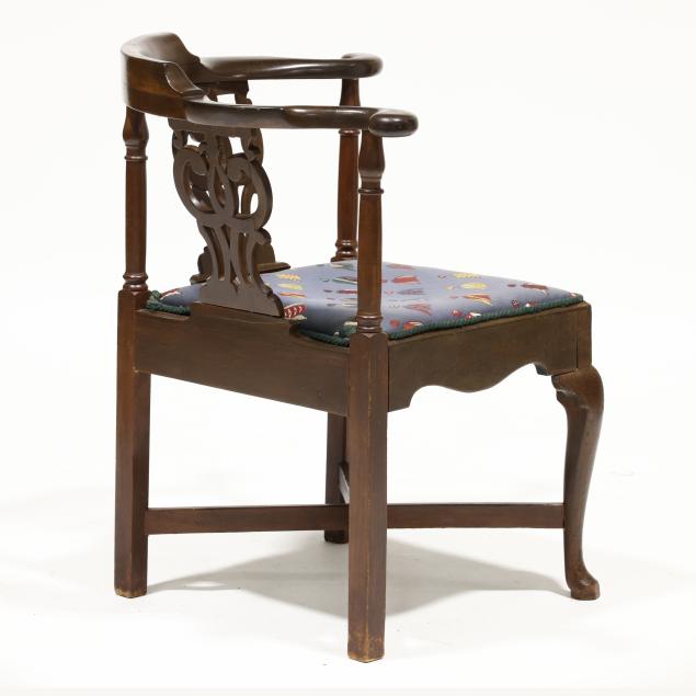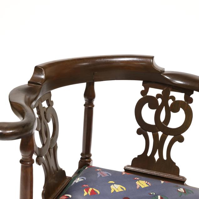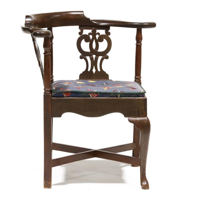 Circa 1760-1770, well developed shaped scrolled arm, turned arm support, pierced double back splat with molded shoe, slip seat, molded flush seat rail, shaped skirt, cabriole front leg, square straight side and rear leg, X-stretcher.