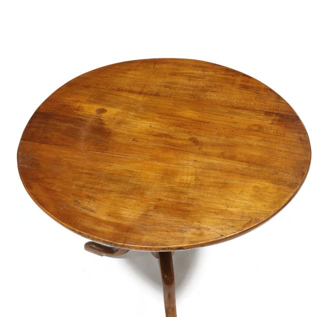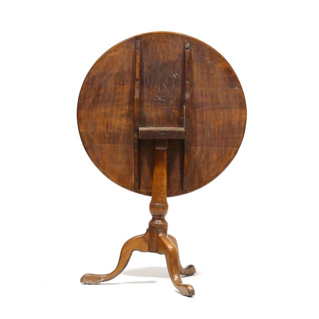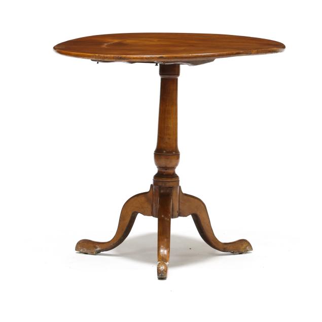 Circa 1760, the circular top with batten and (oak) block support, urn turned standard, tripod base, raised snake foot.