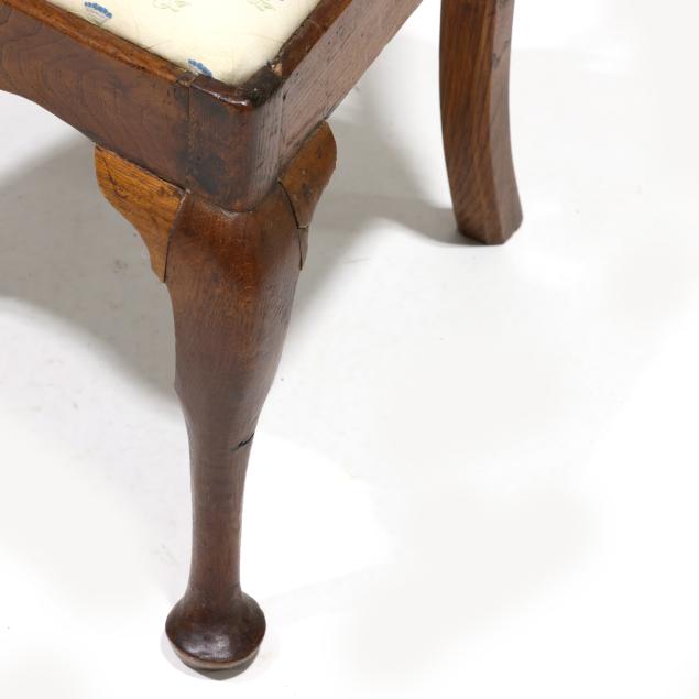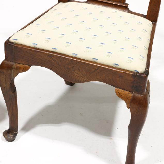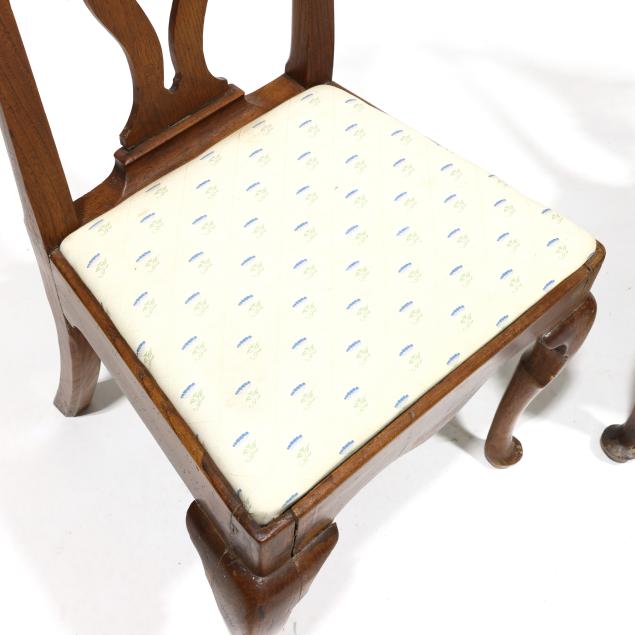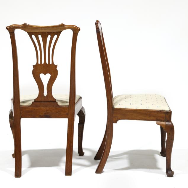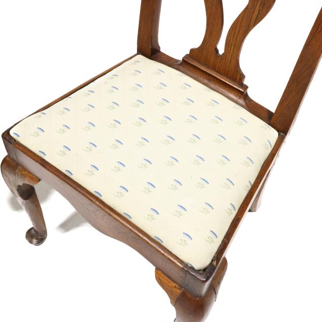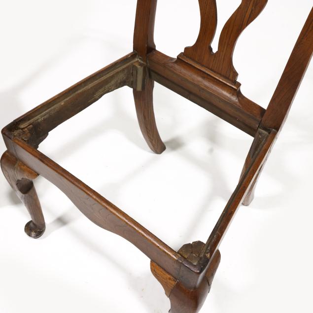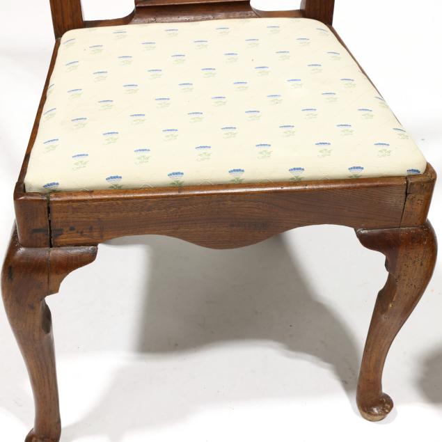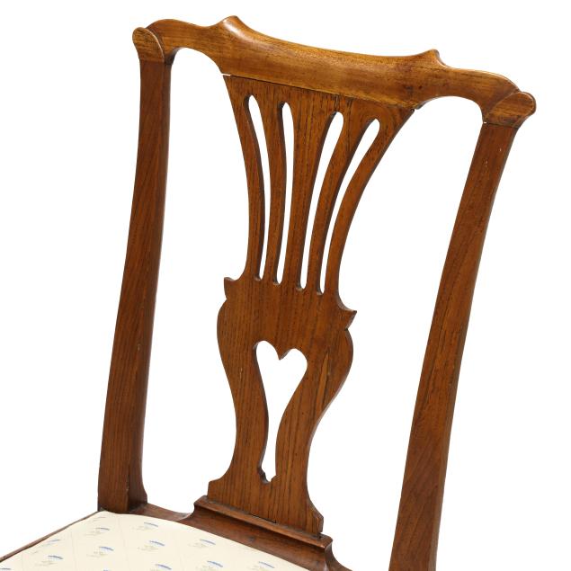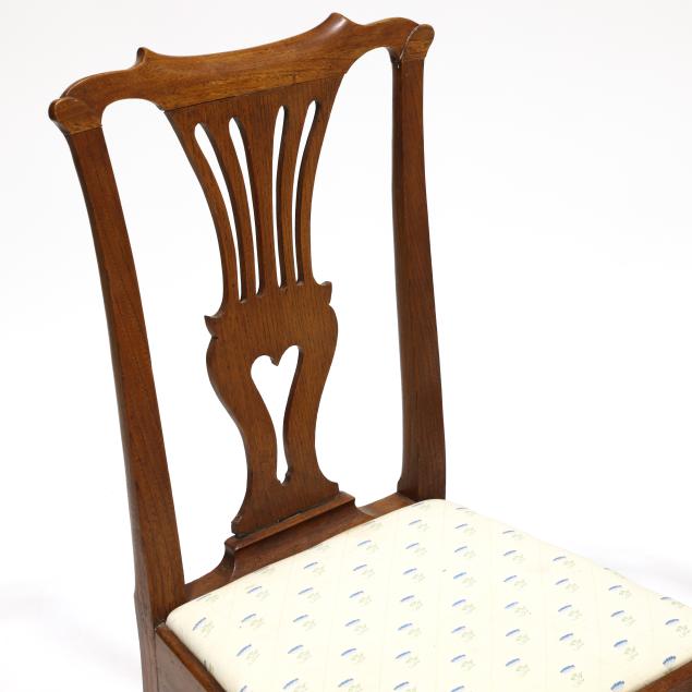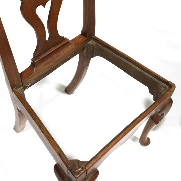 18th century, shaped crest rail, pierced back splat with elongated heart, molded shoe, slip seat, flush seat rail with drop skirt, cabriole front legs with inside notched knee, pad feet.