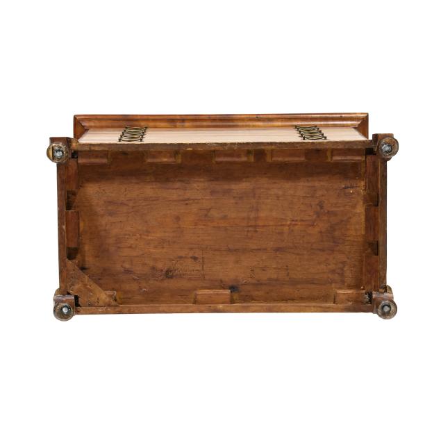 Later pulls; drawer runners rebuilt; missing drawer guides; front right leg with break and repair and missing part of knee return (but original); front left side leg missing return.