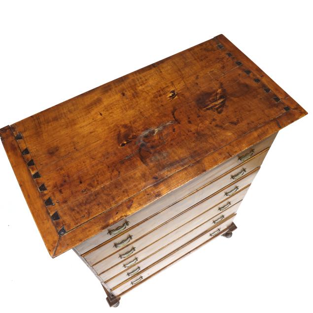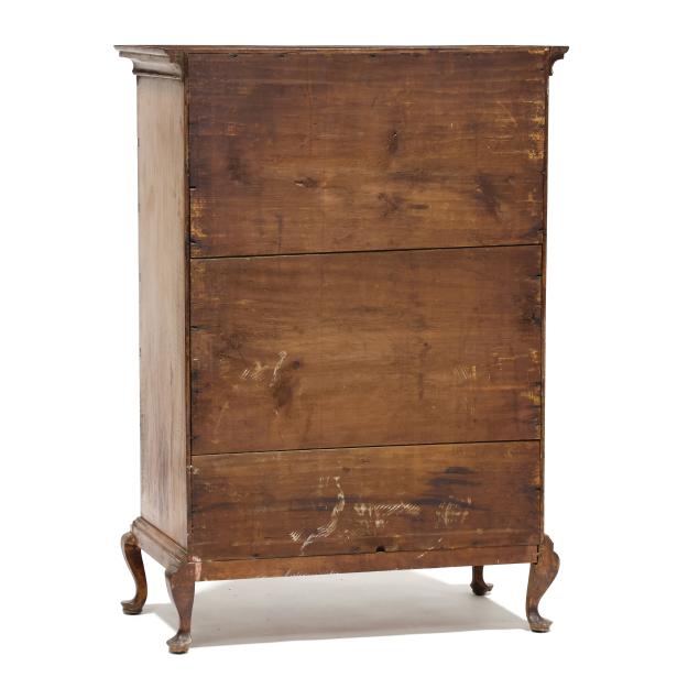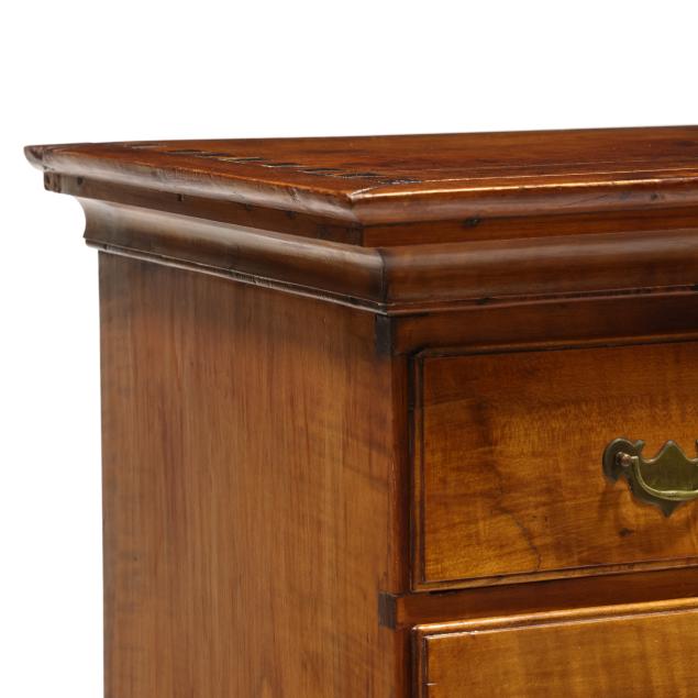 Attributed to New Hampshire, white pine secondary, dovetailed case, applied molded cornice, six lipped graduated drawers, exposed dovetail to the horizontal drawer stiles, attached to lower frame, molded top edge, short cabriole legs with raised pad foot.