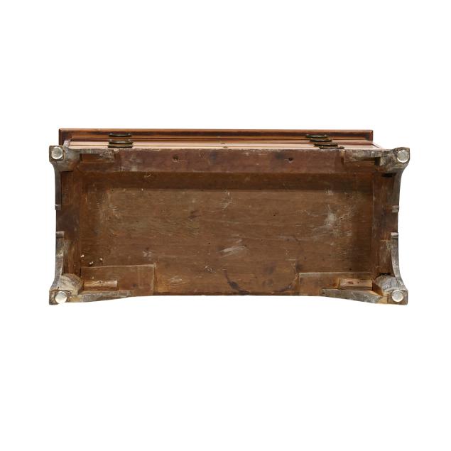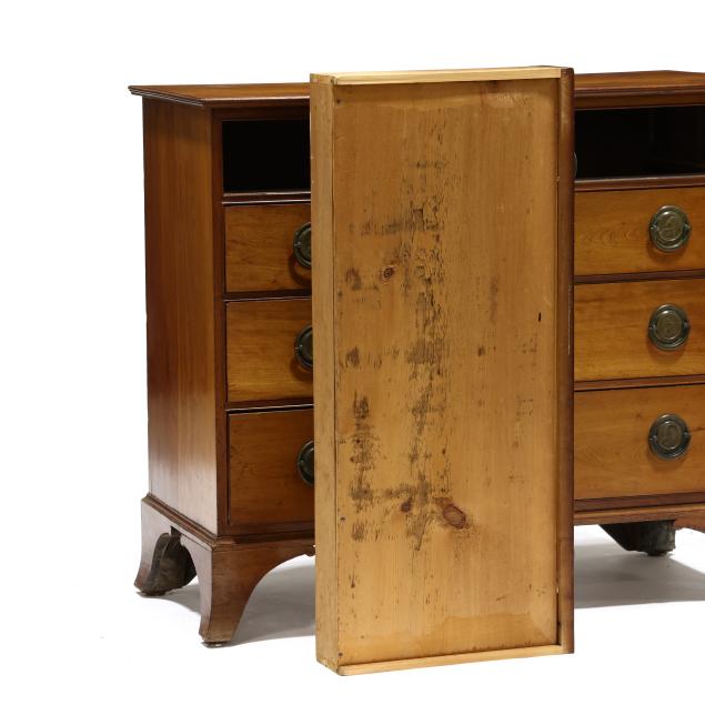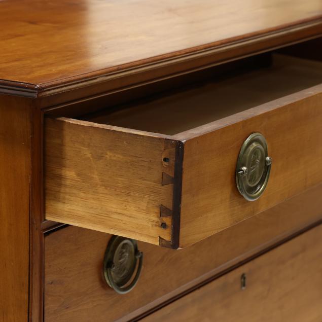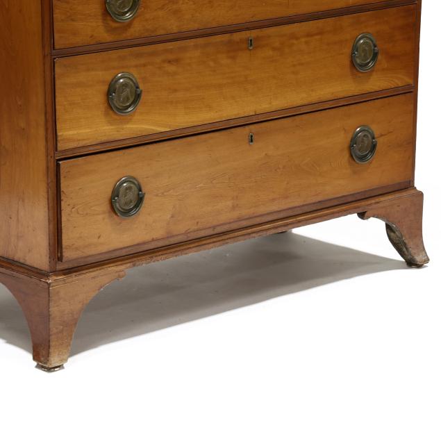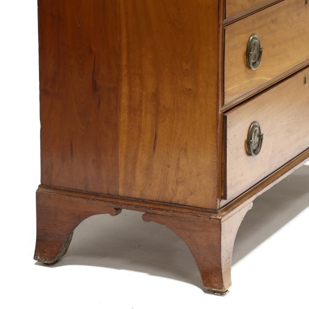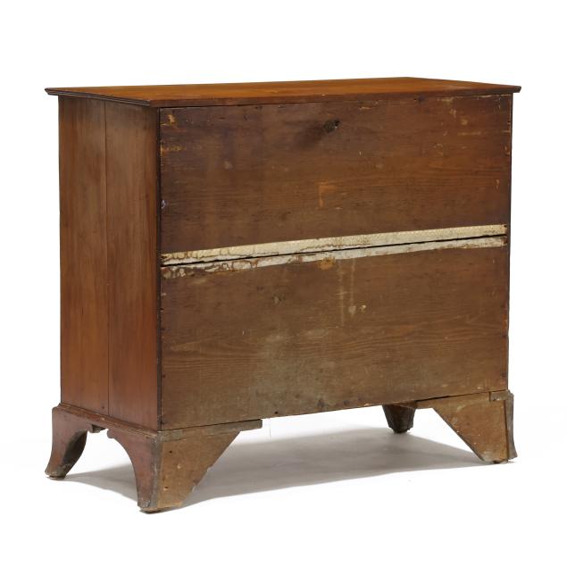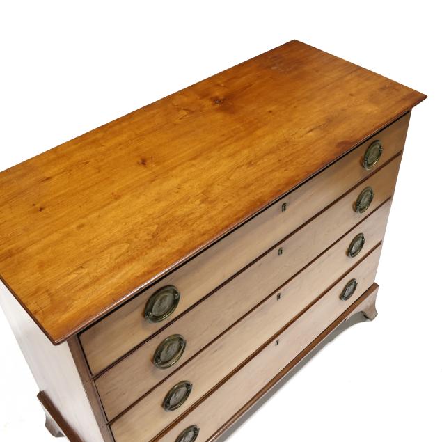 Early 19th century, white pine secondary, the rectangular case featuring a top with molded edge, four flush graduated drawers, the case with cock beaded surround, molded base, original French bracket feet.