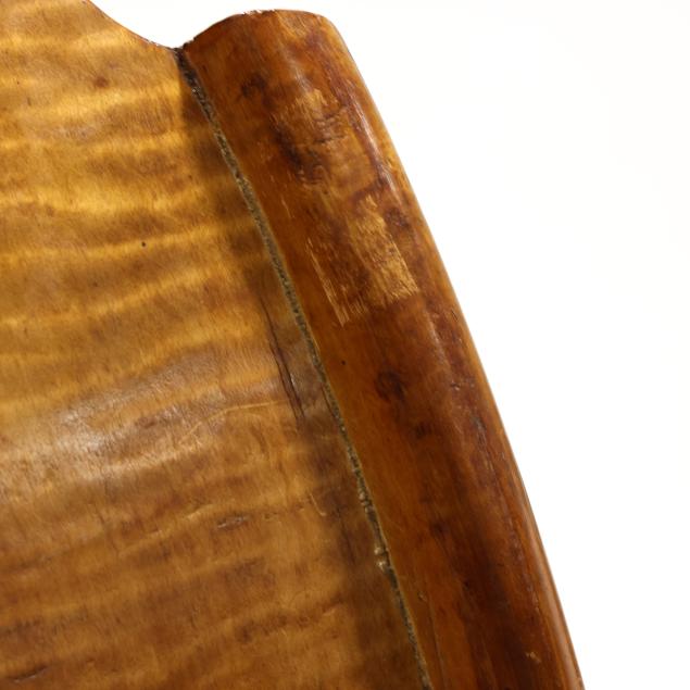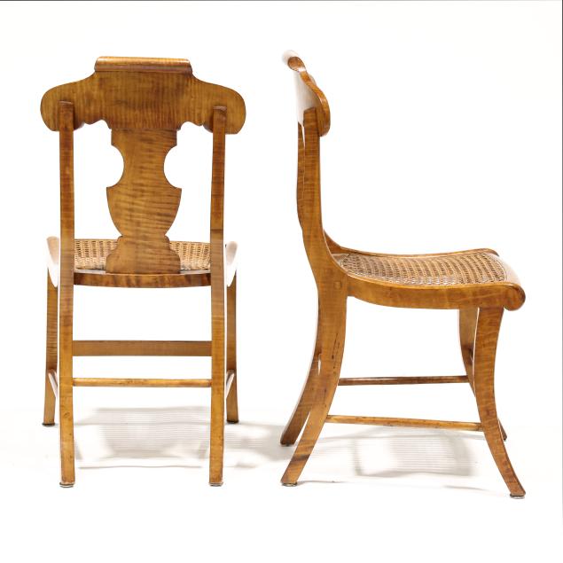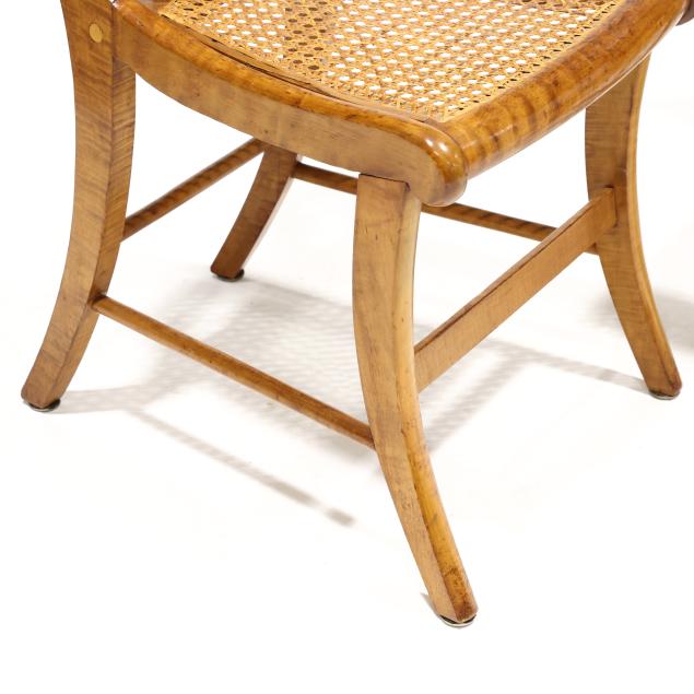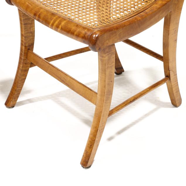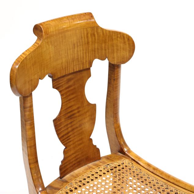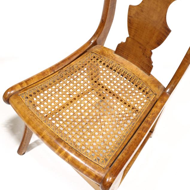 Circa 1840, shaped crest rail, vasiform back splat, cane seat with bowed front rail, saber legs with stretcher base.