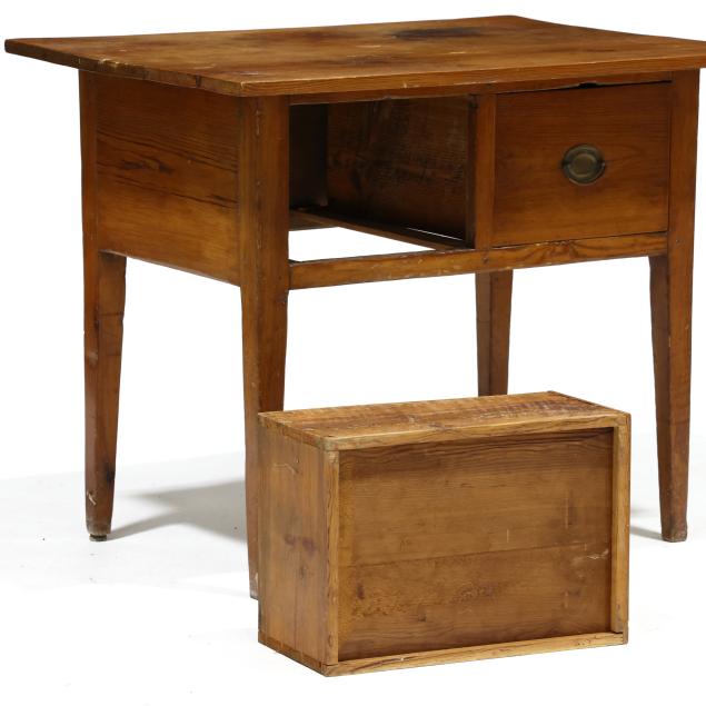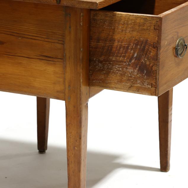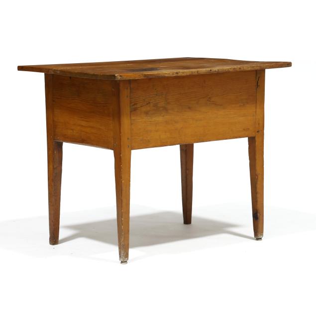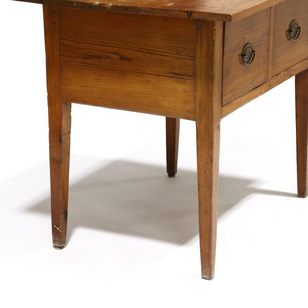 20th century construction from 19th century boards, two board rectangular top with overhang, the case with two flush deep drawers on straight tapered legs.
