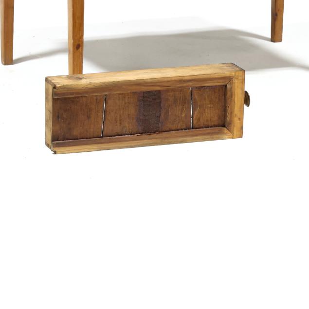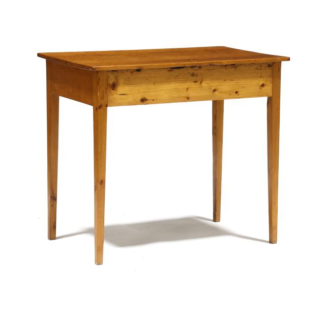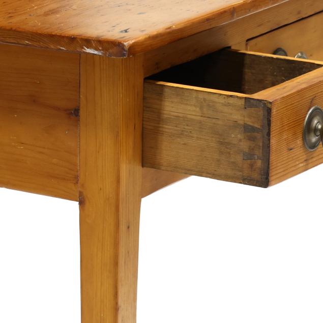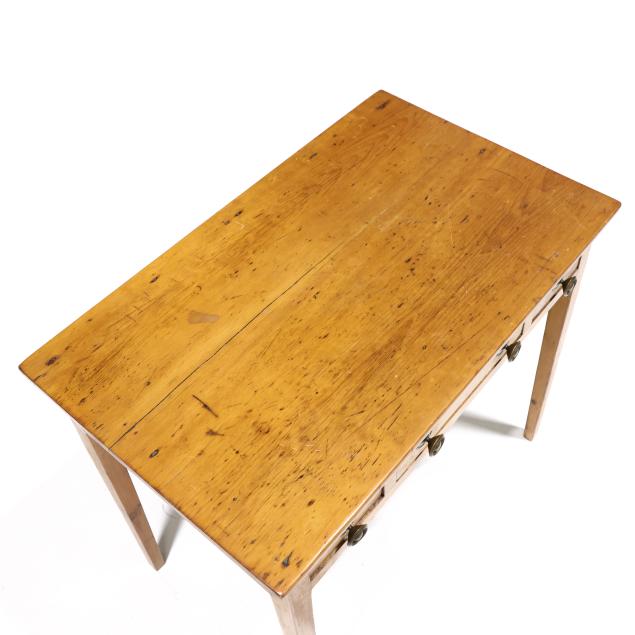Circa 1800, white pine, white pine secondary, rectangular two board top, three flush drawers, straight tapered legs.