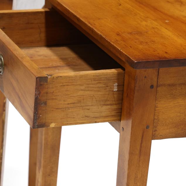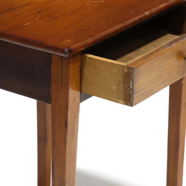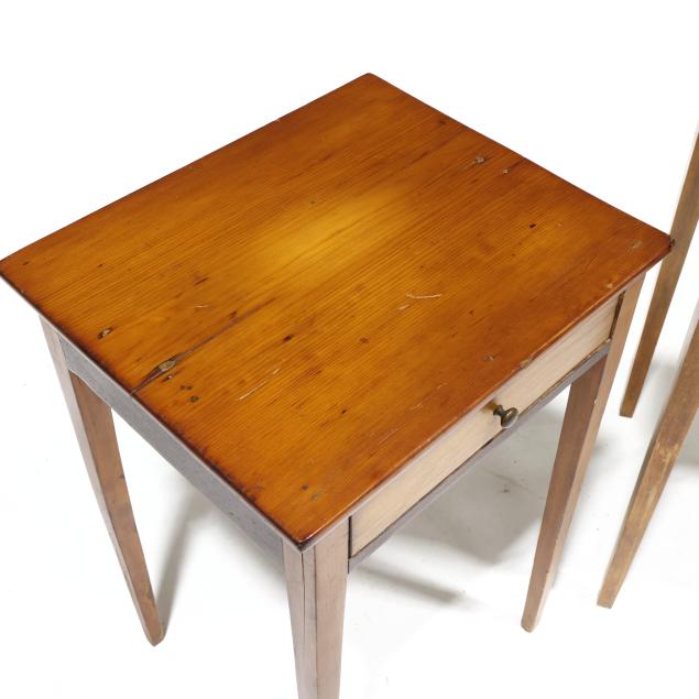From the Estate of the late Peggy Augustus, Old Keswick, Virginia The maple table with reset top having a tight shrinkage crack and areas of staining; the pine table with reset top having shrinkage cracks; the front left leg with crack at top left.