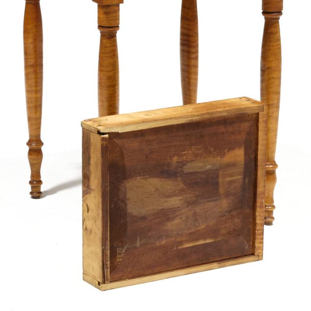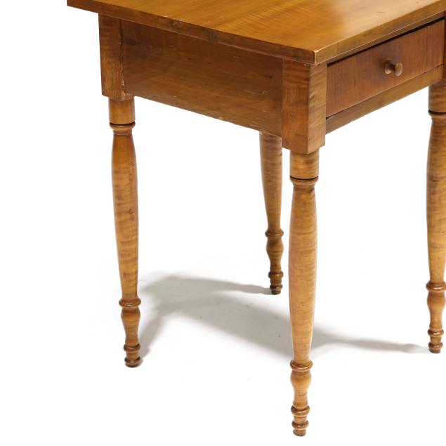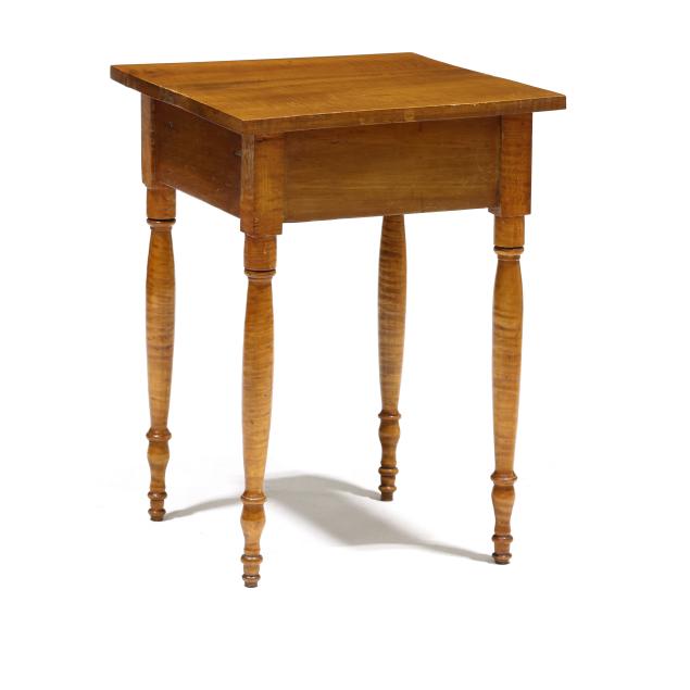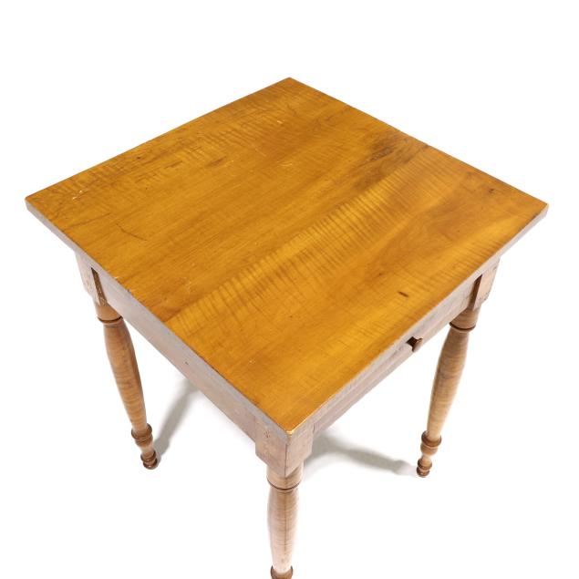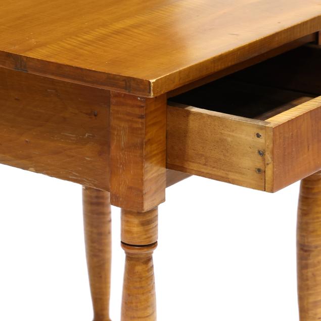 Mid-Atlantic, circa 1840, poplar secondary, top with overhang, single flush drawer, ring turned legs, the case and drawer all done in solid tiger maple.